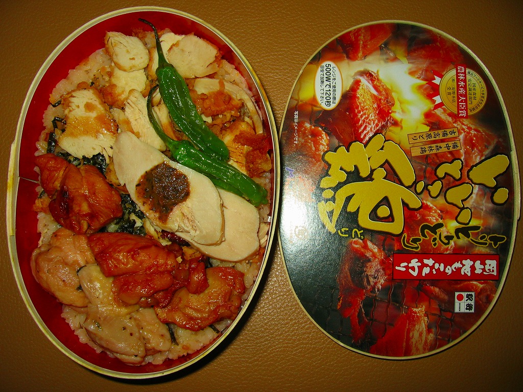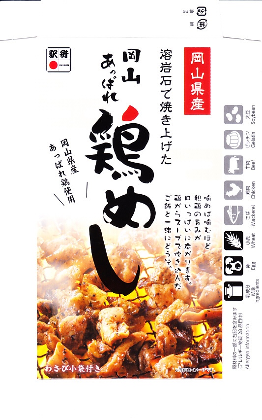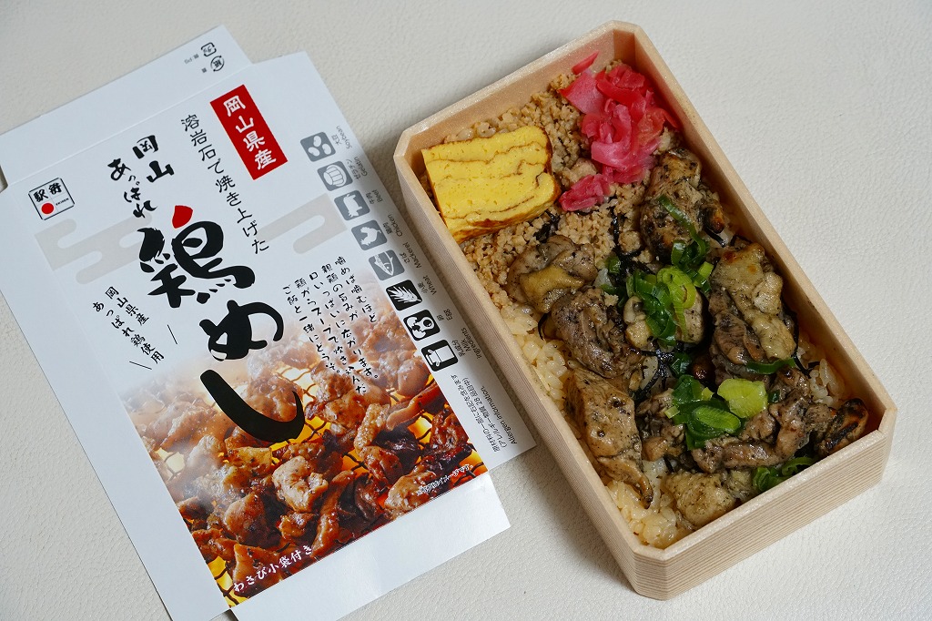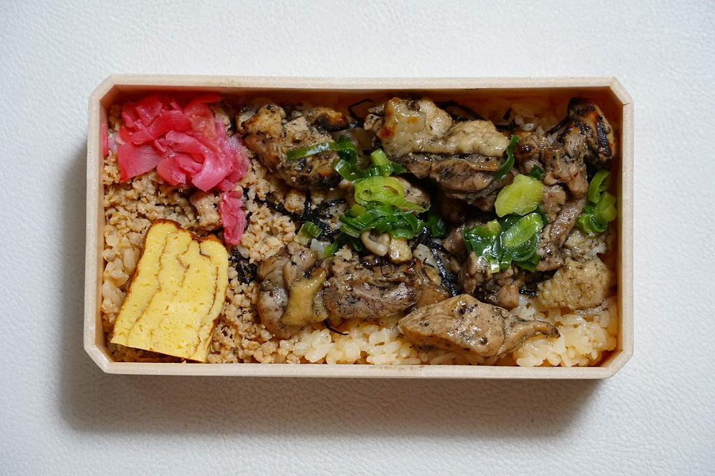 2022(令和4)年8月1日に6種類が発売された、岡山駅弁の新作。長方形の容器に味飯を詰め、刻み海苔で覆い、岡山県産あっぱれ鶏を使うという黒い焼き鳥をゴロゴロころがし、鶏そぼろも載せ、ねぎ、玉子焼、紅生姜で彩る。まるでネギ塩の焼肉を焼き過ぎたような、味や香りや口当たりに視覚でも鶏肉が炭っぽい、硬派で駅弁にはあまりない焼き鶏丼。価格は2022年の発売時や購入時で980円、2023年6月から1,080円、2025年時点で1,150円。