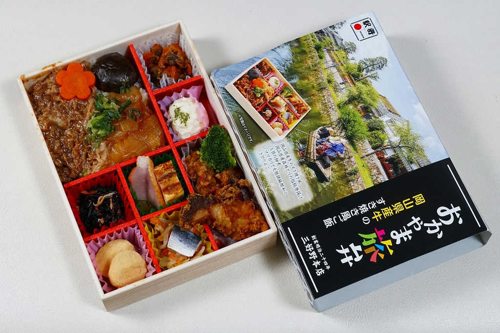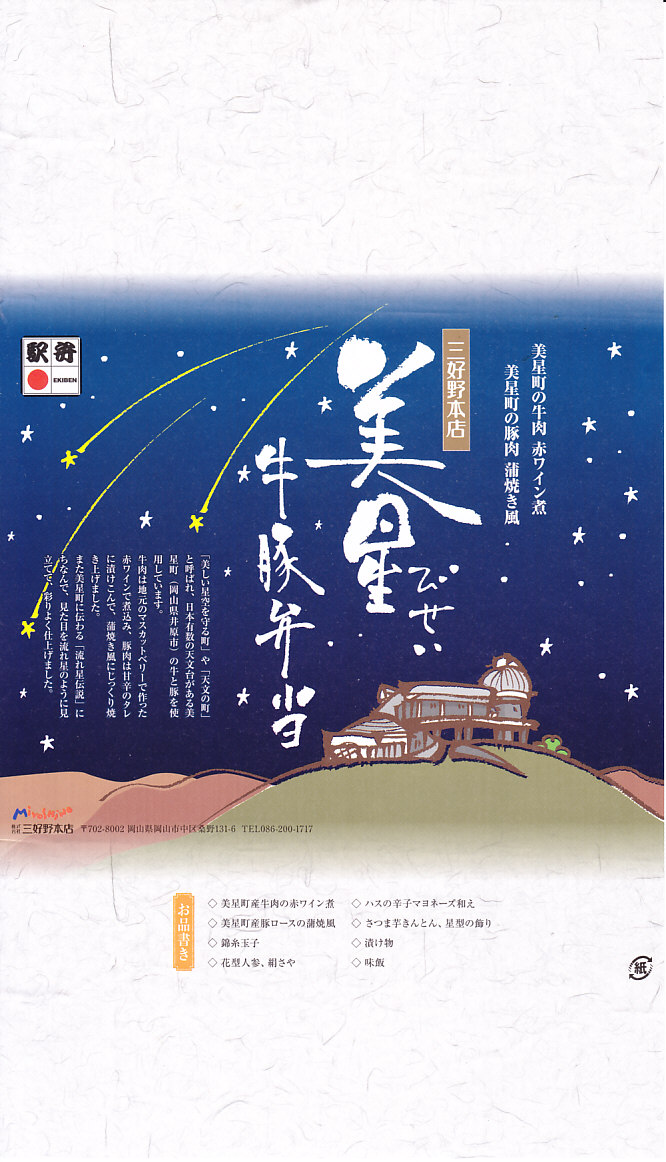 2012(平成24)年11月1日の発売。薄い木でできたエコな容器に味飯を詰め、錦糸卵とともに美星町の牛肉の赤ワイン煮と豚肉の蒲焼きを貼り付け、レンコンの辛子マヨネーズ和え、大根漬、サツマイモきんとんなどを添えるもの。肉はいずれもとてもしっかりした歯応えで、分量の割に飯が進む気がした。価格は2013年の購入時で1,000円、2014年時点で1,100円。2014年までの販売か。