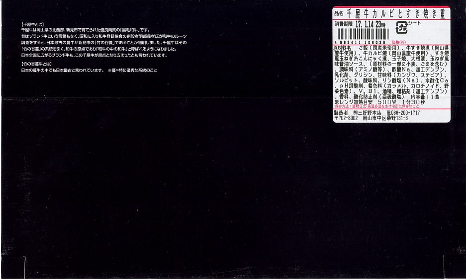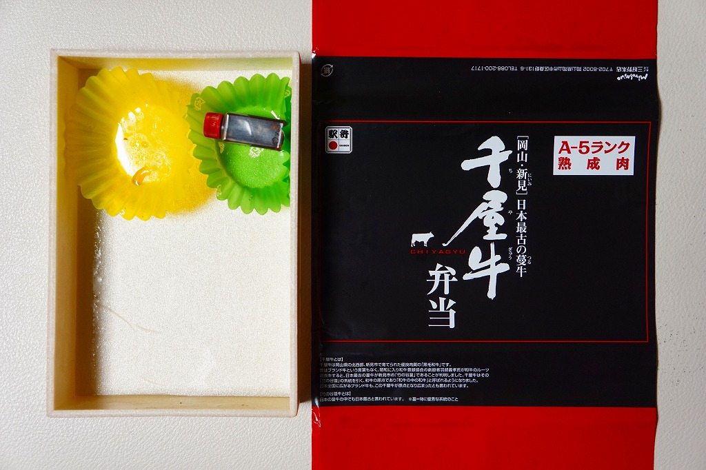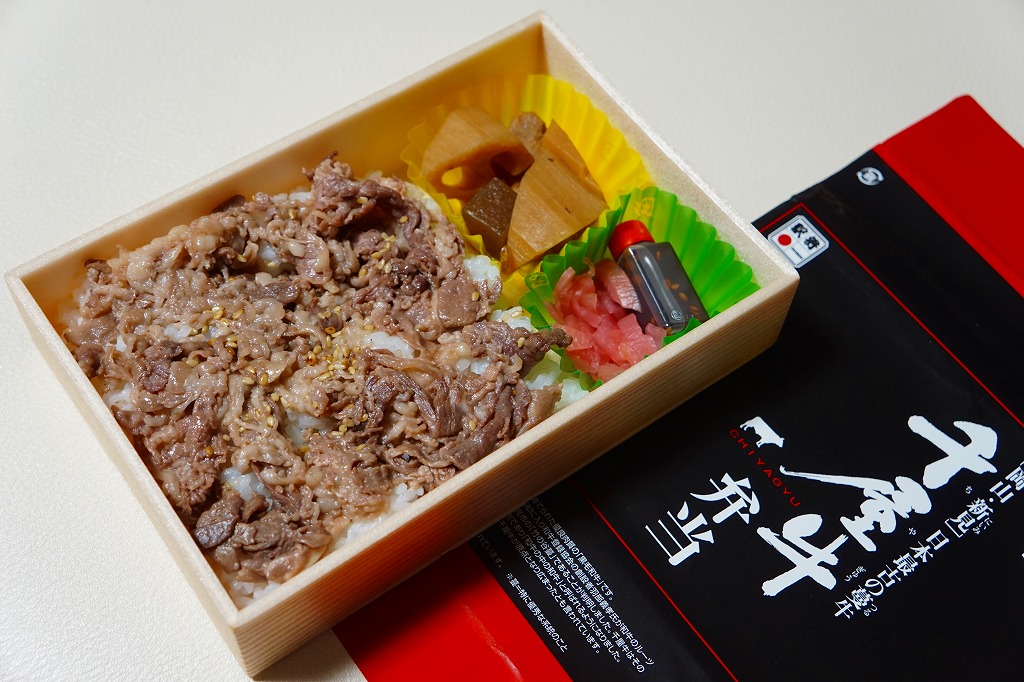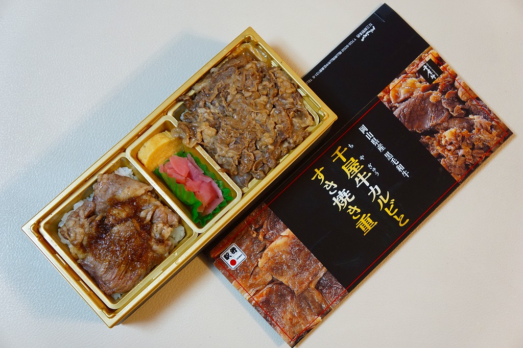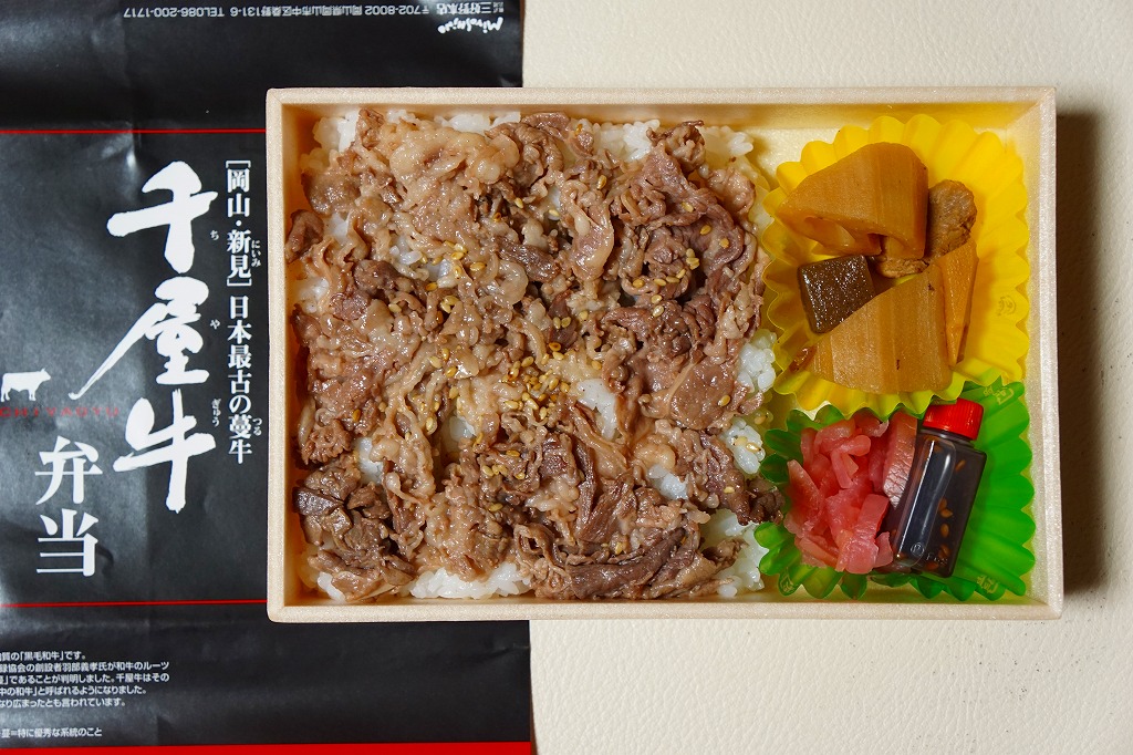 2017(平成29)年1月の京王百貨店の駅弁大会で輸送販売。2016〜2017年の駅弁大会シーズンに売られた商品と考えられるが、他で売られたという情報が得られない。駅弁の名前のとおり、パッケージの写真のとおり、千屋牛(ちやぎゅう)のカルビ丼とすき焼き丼が、小さな正方形のトレーにひとつずつ収まり、その間に玉子焼と大根桜漬のトレーを収める。輸送の冷たさか、タレの量や味なのか、東と西の味覚の違いか、肉の量や質あるいは丼として、1,780円の価格が感じられるものがあったかどうか。