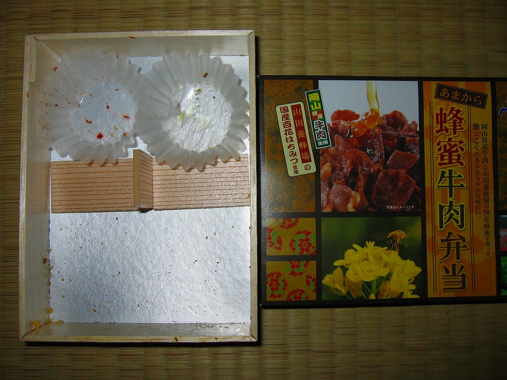2008(平成20)年7月15日に発売。「おかやま和牛肉弁当」と同じ容器を使用、ボール紙のふたの文字や写真にハチミツがあふれる。中身は岡山県産の白御飯の上に、やはり岡山県産牛の蜂蜜煮とそぼろを敷いて、玉子そぼろも振りかけた牛丼に、みぶ菜漬と大根漬を添えるもの。牛肉はハチミツで甘く、タレで辛く、いやがおうにも食が進むし、少量なのであっと言う間に食べ尽くしてしまう。現存しない模様。