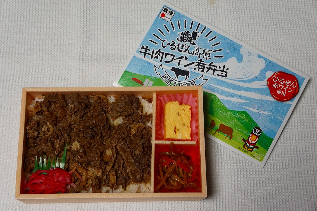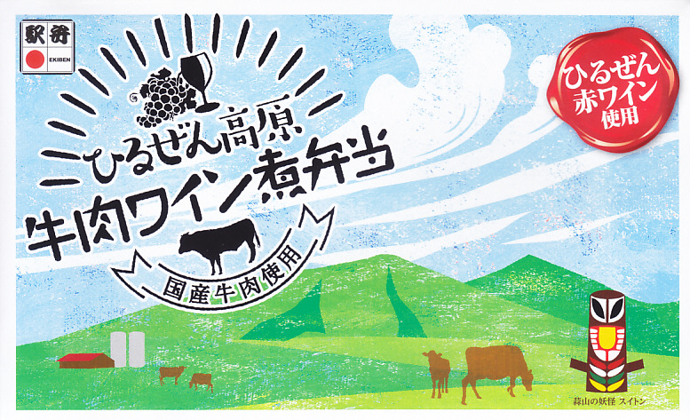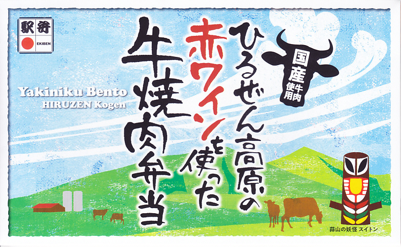岡山県北部の蒜山(ひるぜん)をテーマにした駅弁として、2017(平成29)年9月1日から30日まで販売。2018(平成30)年4月に再発売。ボール紙のふたの絵柄は、岡山県北部の観光地「蒜山(ひるぜん)高原」の風景や立看板だと思われる。白御飯を牛肉煮で覆い、紅生姜、きんぴらごぼう、玉子焼を添える、 ごく普通の味と内容の牛肉駅弁。再発売も1か月程度か、東京駅限定で実施か。
