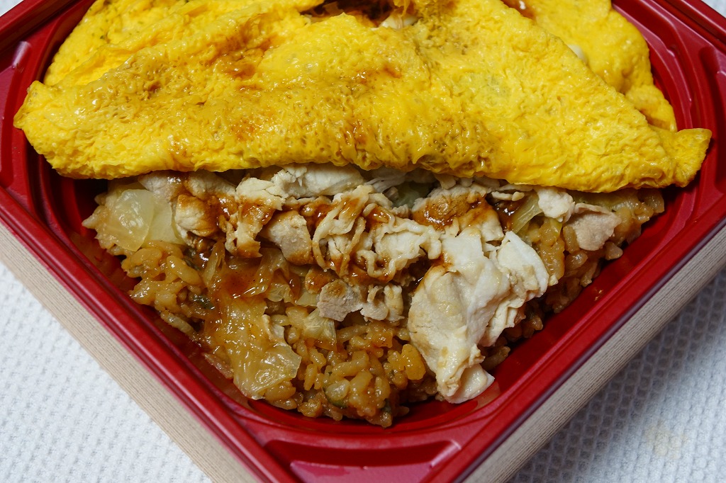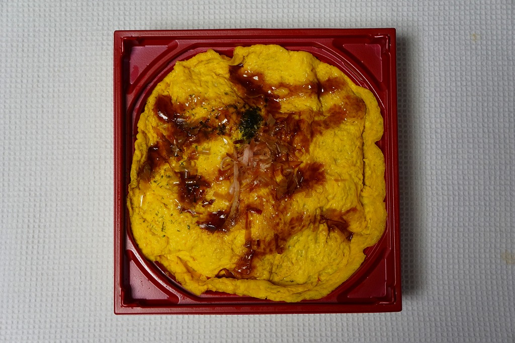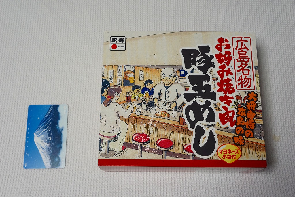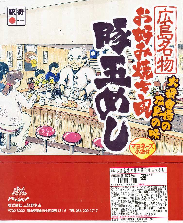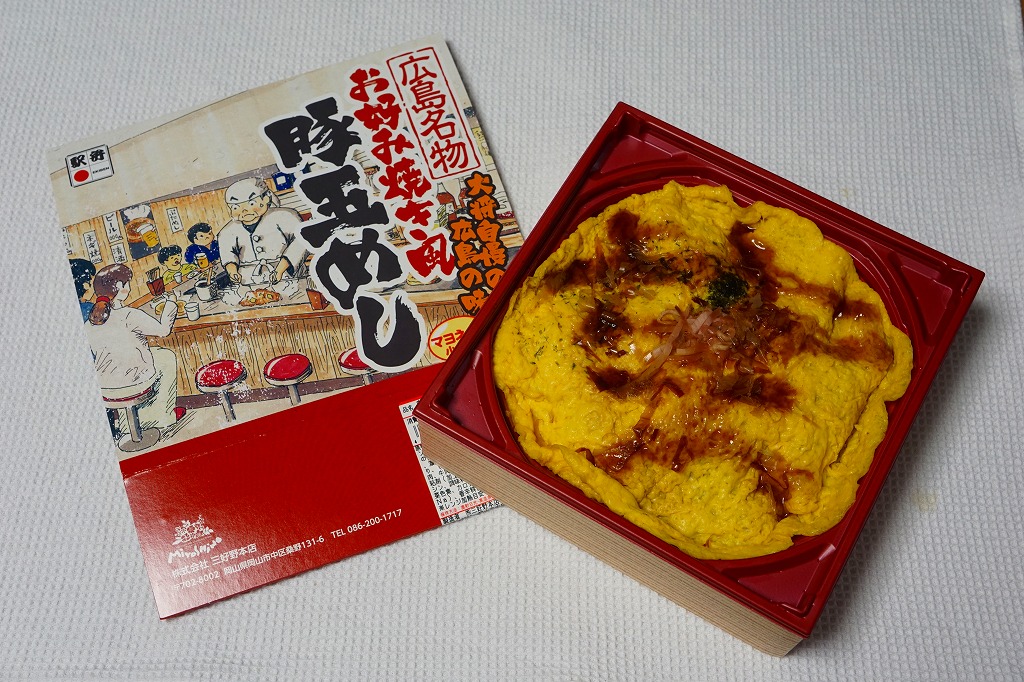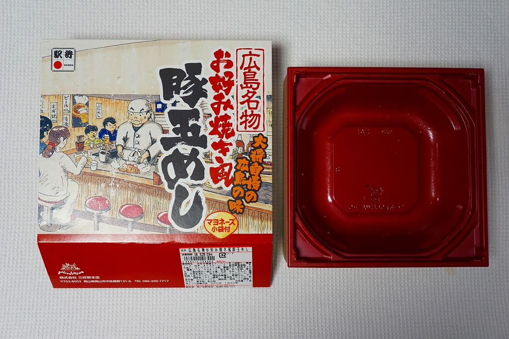 2018(平成30)年秋の新作か。その名のとおり、広島名物お好み焼き風豚玉めし、広島風お好み焼きの中身のうち焼きそばを御飯に置き換えたもの、麺でなく飯にソース味を付け、豚肉と薄焼き卵で覆うものが1枚、正方形の容器にすっぽり収まる。マヨネーズもオタフクのものを添付する、岡山駅弁に見えない広島づくし。2019年までの販売か。