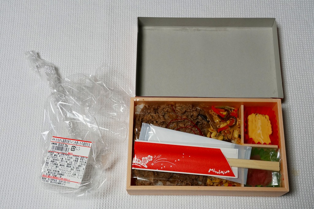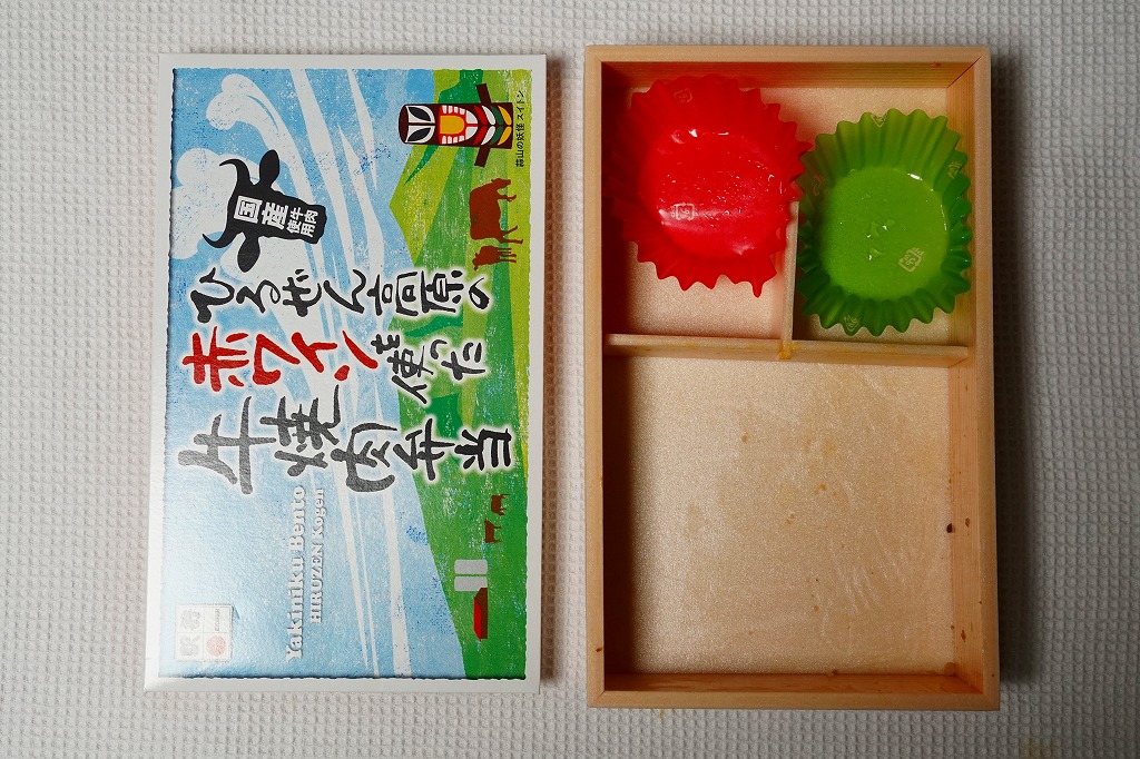 2018(平成30)年9月1日の発売だそうな。白飯をナムルと牛肉煮で覆い、玉子焼と大根桜漬を添える牛肉駅弁。パッケージの既視感と名称の違和感を覚えながら買ってみたら、半年前に同じ売店で買った下の「ひるぜん高原牛肉ワイン煮弁当」とほぼ同じもので、名前を変え、御飯を覆う牛肉を減らしてナムルを加えたものだった。2019年8月限りで終売。