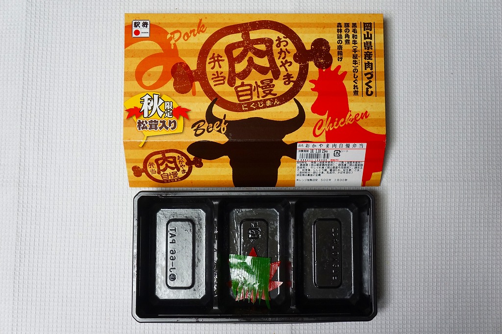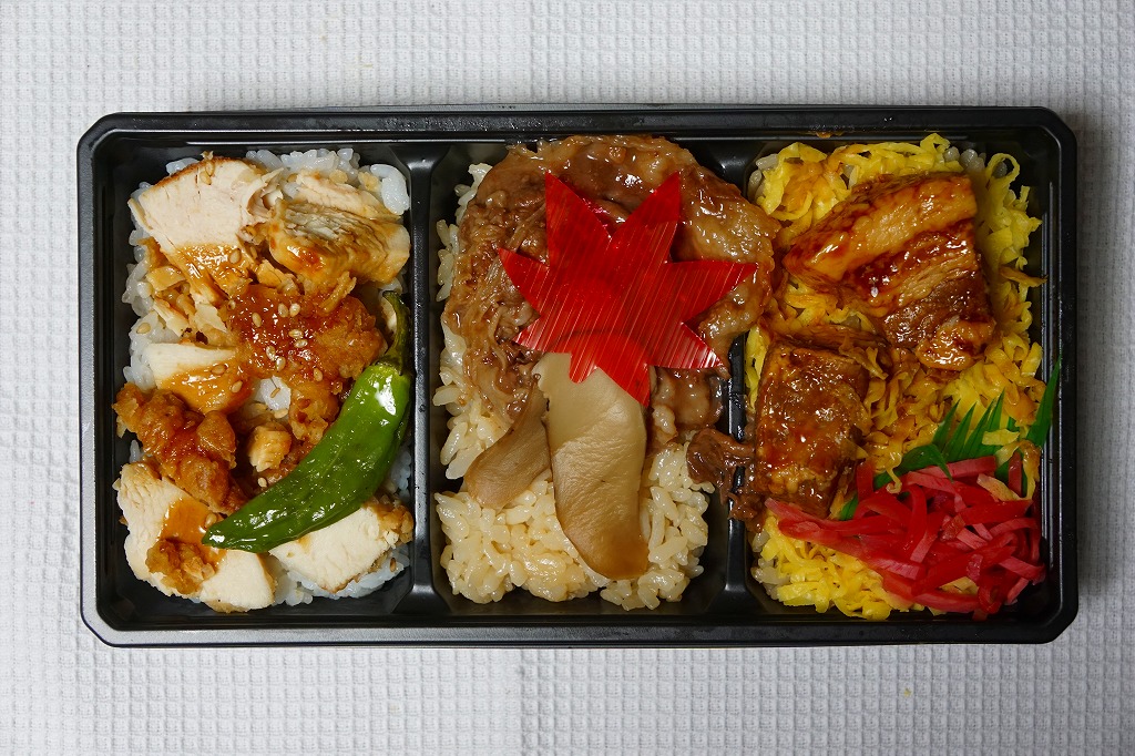岡山駅の秋の駅弁の新作として、2017(平成29)年9月から12月まで販売。黒いプラ製トレーの3つのくぼみに、白飯を岡山県産の森林鶏の唐揚のスライスで覆う鶏丼、茶飯を黒毛和牛(千屋牛)のしぐれ煮とマツタケで覆う牛丼、茶飯を錦糸卵と岡山県産の豚の角煮と紅生姜で覆う豚丼が、それぞれ収まる。本来の販売期間が過ぎた真冬の東京への輸送の影響か、牛の脂と豚の赤身はカチカチで、鶏照焼の乱切りの、ササミ風のあっさり感と衣のクリスピーが美味だった。