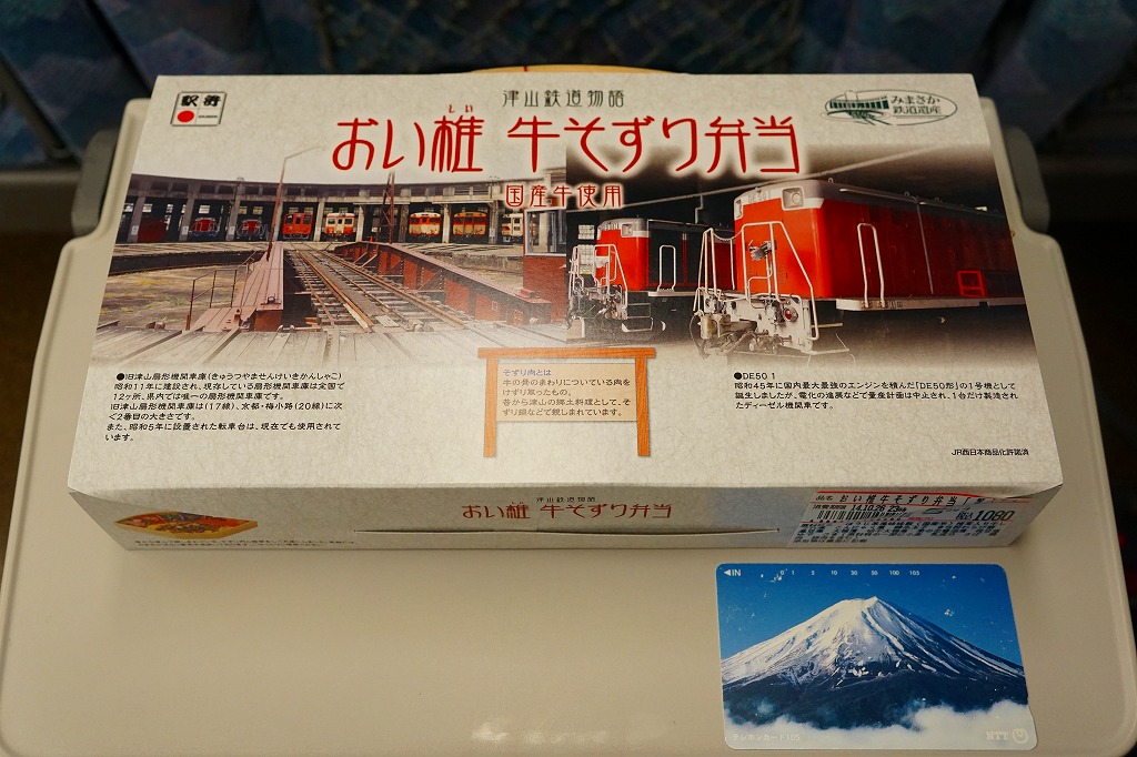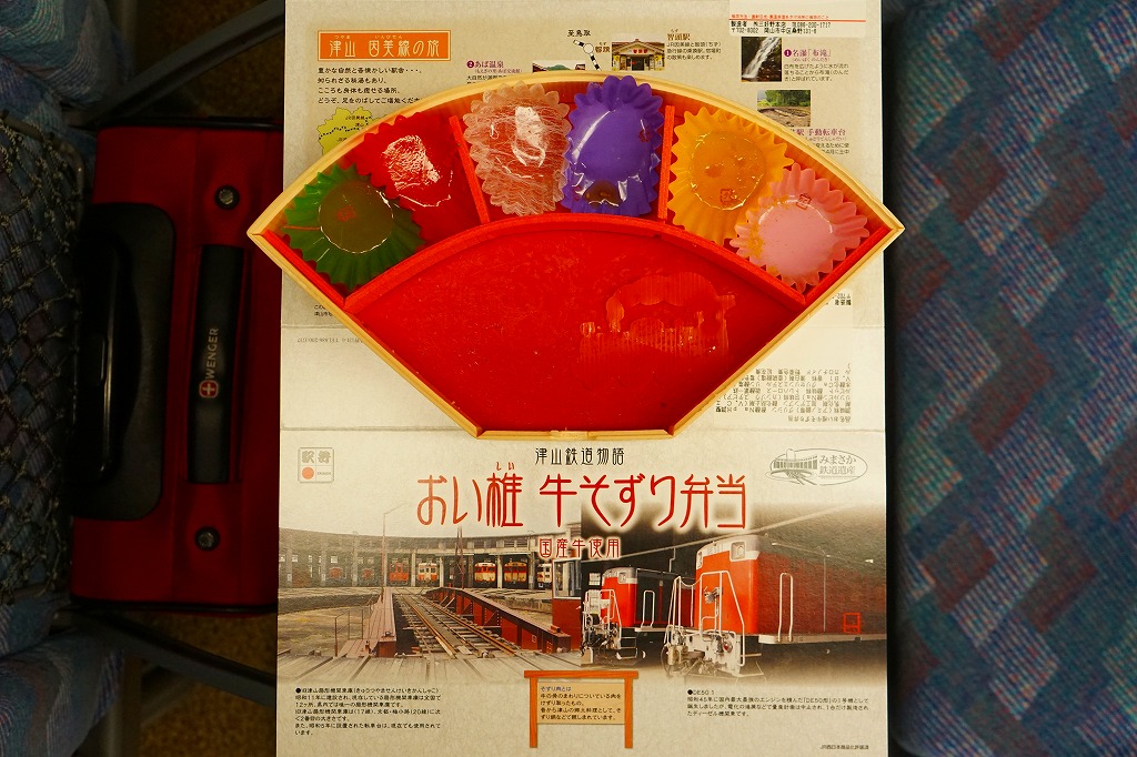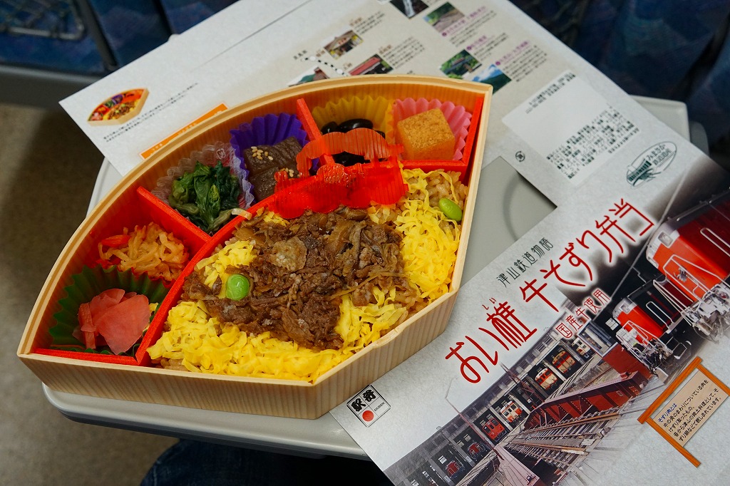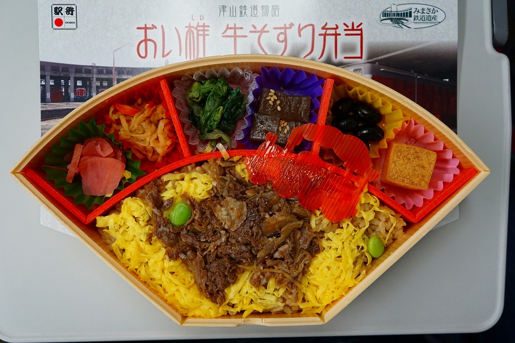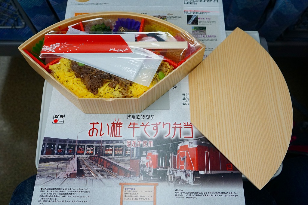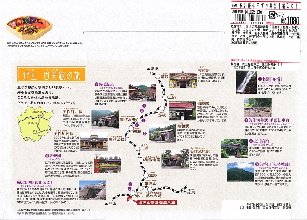 2014(平成26)年9月1日に発売。JR西日本岡山支社とジェイアールサービスネット岡山と三好野本店との連携による、津山市の地域の魅力を活かした駅弁。扇形の容器にほうじ番茶風味の茶飯を詰め、シイタケ入りの牛しぐれ煮と錦糸卵で覆い、左から大根漬、切り干し大根、菜の花醤油漬、こんにゃく煮、黒豆煮、きな粉わらび餅の6種を付け合わせる。