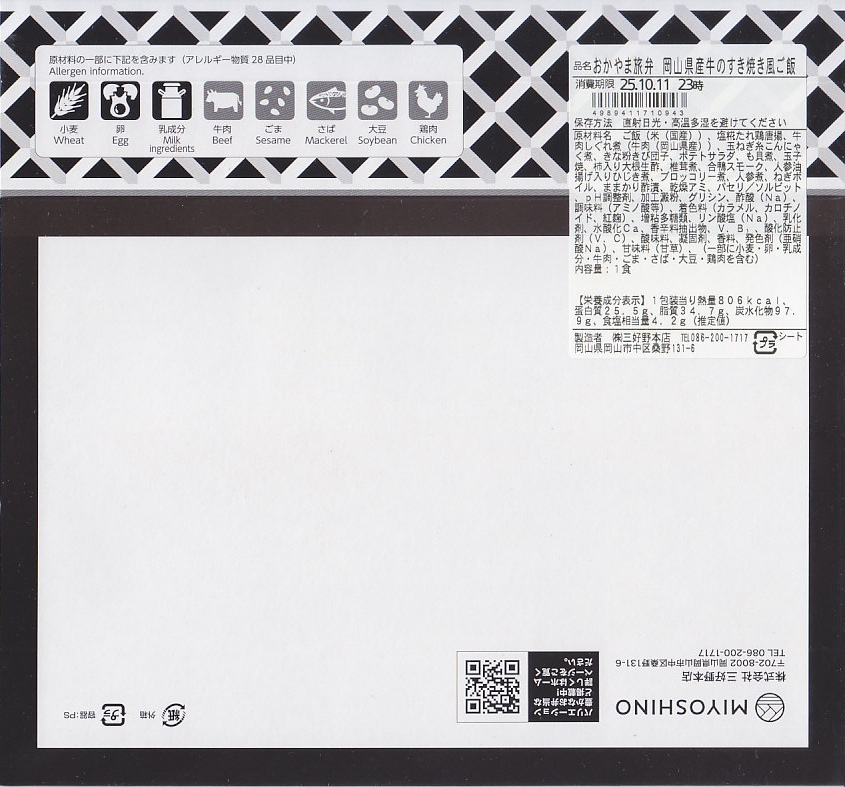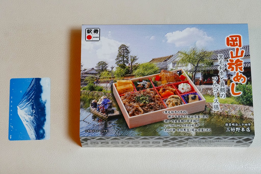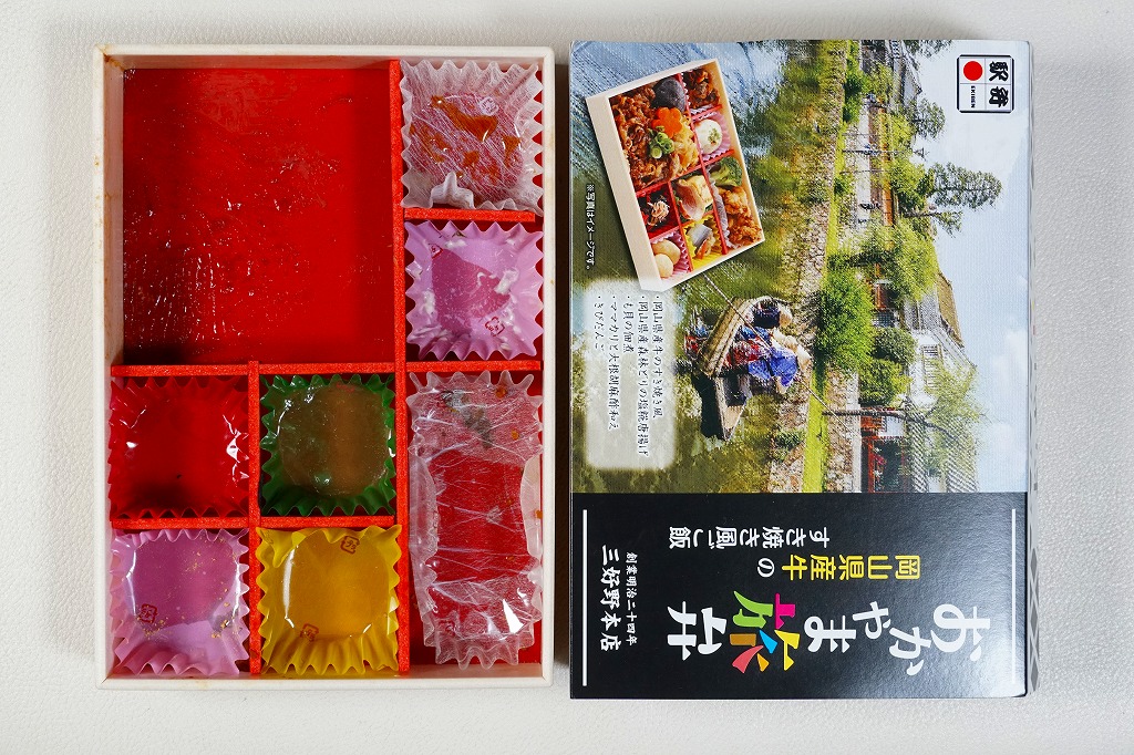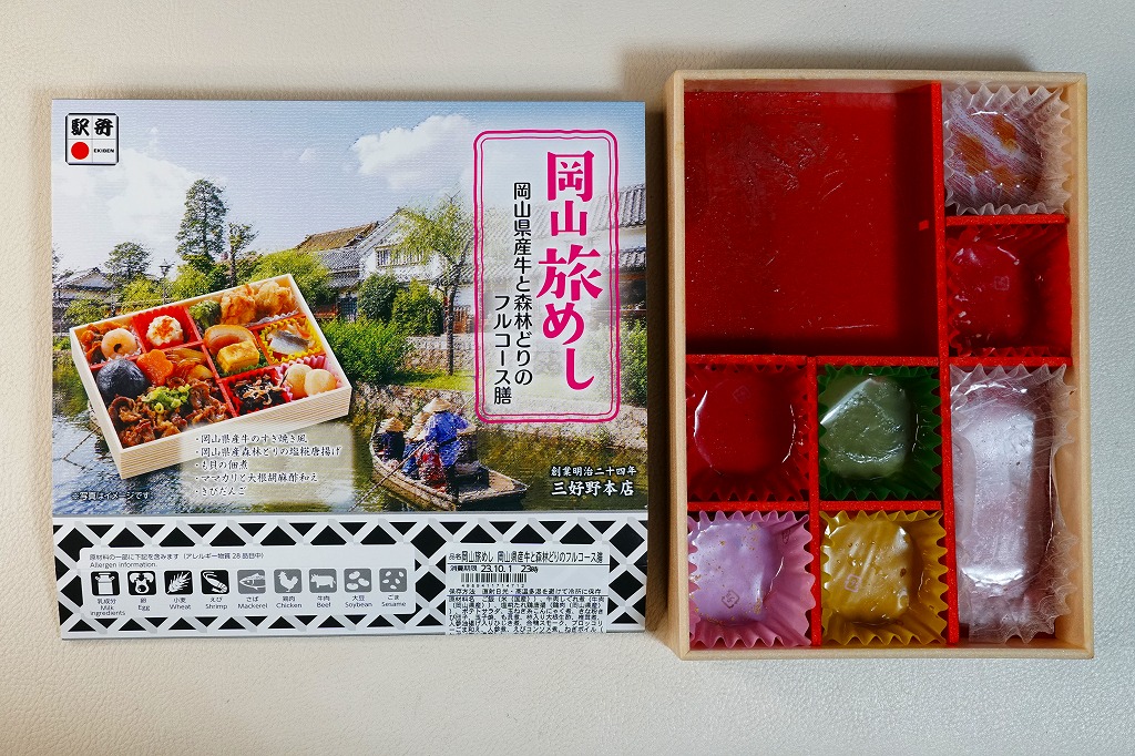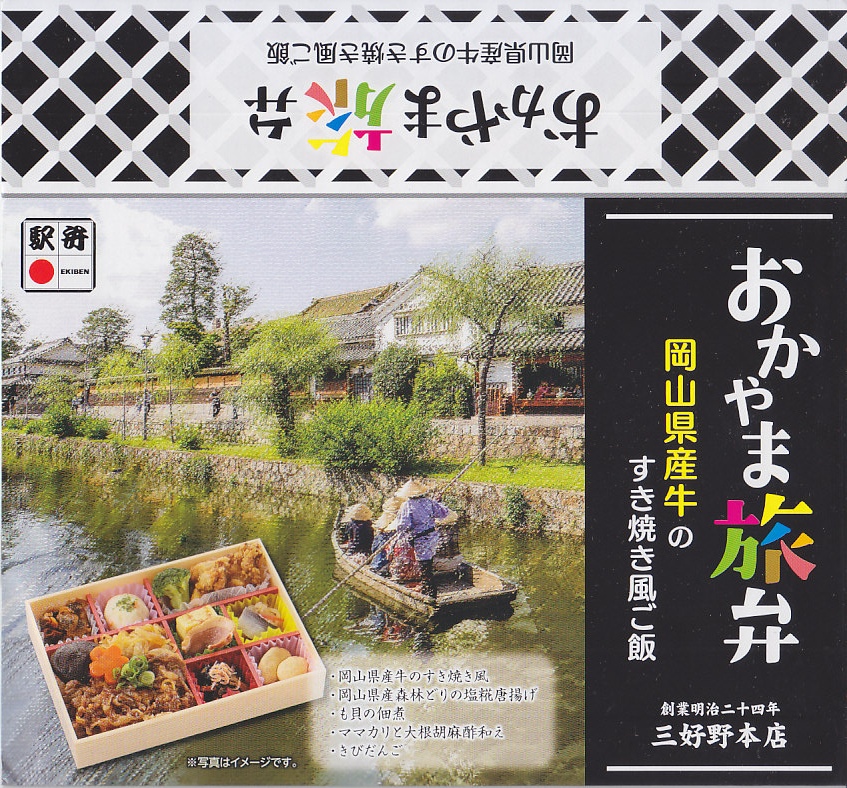 2025(令和7)年7月に岡山駅などで発売か。あるいは「岡山旅めし岡山県産牛と森林どりのフルコース膳」の改称なのだろうか。新作の駅弁として、10月からのJR東日本の駅弁キャンペーン「駅弁味の陣2025」にエントリー。スリーブの絵柄は以前の「岡山旅めし」と同じ絵柄の、倉敷美観地区の風景と蔵でできている。中身は地産食材から郷土料理まで味わえるお弁当といい、白飯を牛肉や煮物で覆う「岡山県産牛のすき焼き風」に、岡山県産森林どりの塩糀唐揚げ、も貝の佃煮、ママカリと大根胡麻酢和え、ポテトサラダ、玉子焼、柿入り大根なます、合鴨スモーク、人参油揚げ入りひじき煮、ブロッコリー煮、きびだんご。名前から牛肉弁当に思えて、中身は「倉敷小町」や「後楽園のお弁当」のような季節物の岡山駅弁に感じた。あるいはそれらの生まれ変わりか。