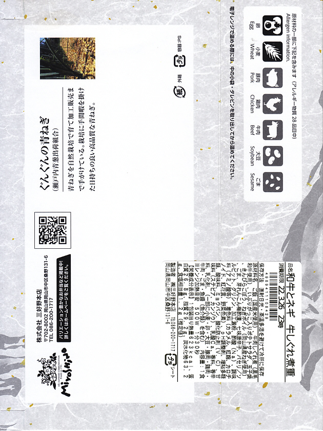 中身はスリーブの写真のとおり、駅弁の名前にあるように、瀬戸内青ねぎを載せた黒毛和牛のぎゅうめし、瀬戸内産真鯛の甘辛揚げ、いぶりがっこ入りポテトサラダ、わらび餅作州黒豆添え、玉子焼、ひじき煮、鶏照焼、野菜コンソメ煮。御飯が牛飯なので、お肉の駅弁のページに入れたが、あるいは幕の内弁当のようなものか。10月以降も販売が継続され、2022年の6月か7月頃まで売られた。