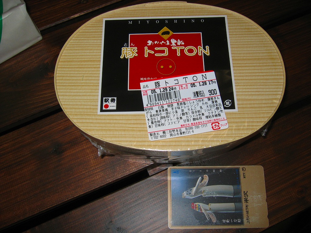 2004(平成16)年の夏頃に発売。楕円形の経木枠の容器に縁が付いたふたをして、掛紙代わりの商品名シールを貼って、ラップで包み食品表示ラベルを貼る。中身は白御飯の上に岡山県産黒豚の焼豚が数切れと塩胡椒炒めがたっぷり入り、レンコンや青唐などが入り。タレと辛子マヨネーズの袋を添付する。味はあっさりした豚肉の脂味豊かな豚丼で、マヨネーズとの相性が良く分量もそこそこあり、軽い名前に違い重量感のある感じ。商品名を単に「豚丼」などとしなかったことは、吉と出るか凶と出るか。価格は2005年の購入時で900円、2014年時点で1,080円。2014年までの販売か。