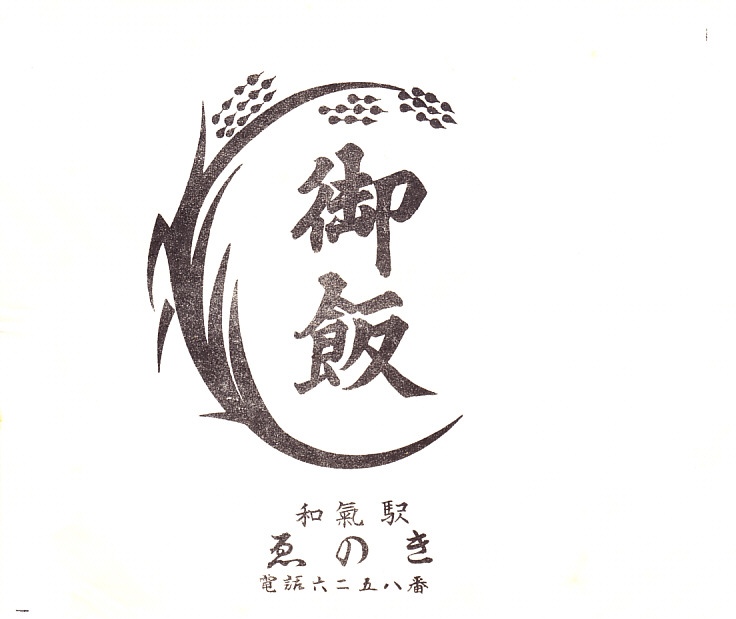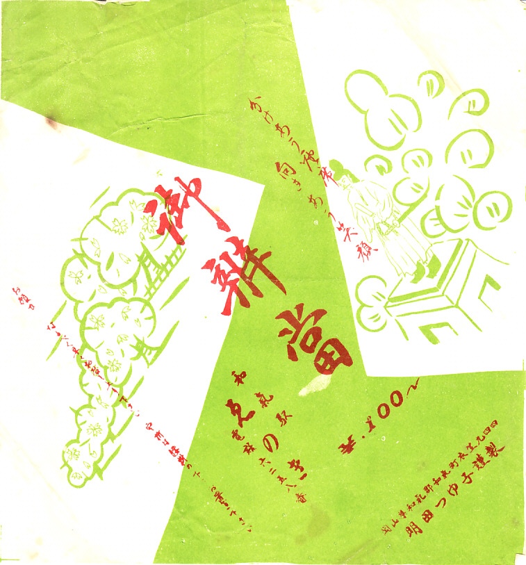 入手状況から1963(昭和38)年のものと思われる、昔の和気駅弁の掛紙。今も桜の名所である和気神社の芳嵐園と、東京で皇居のお濠に向き立つ和気清麻呂像か。調製元のえのきは1910年代から和気駅で営業した、後の播州赤穂駅や相生駅の駅弁屋。