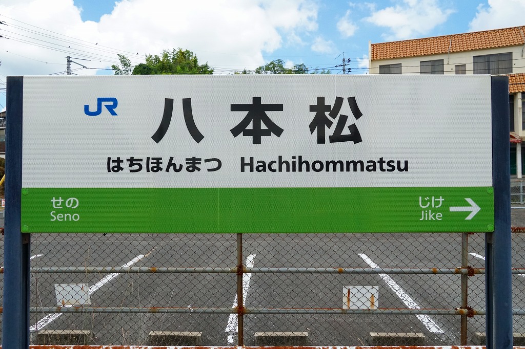 広島駅から山陽本線の電車で約30分。明治時代の山陽鉄道会社が徹底的に急勾配を避けて建設した現在のJR山陽本線について、瀬野駅から八本松駅までの約10キロメートルにだけ22.6パーミルもの坂道があり、昔の蒸気機関車や現在の貨物列車向け電気機関車が、この駅間で補機として増結される。八本松駅に駅弁はないが、かつて戦前昭和時代には構内営業者がいたという。1895(明治28)年4月4日開業、広島県東広島市八本松町飯田。