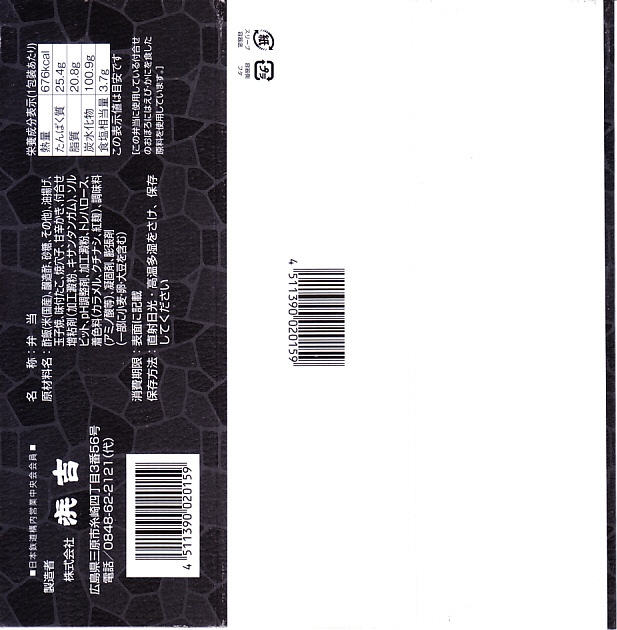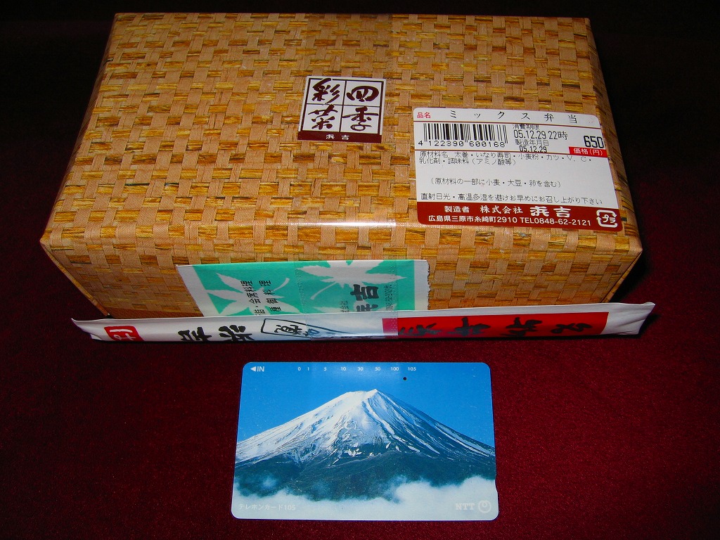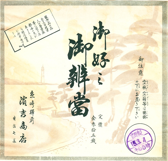 1960年代の、5月22日10時の調製と思われる、昔の三原駅弁の掛紙。記載内容からして駅弁の掛紙に違いないが、絵柄は市中あるいは市販の弁当のもののようにみえる。駅名の列記で糸崎駅より三原駅が上になっており、糸崎の機関区が鉄道の要衝だった汽車の時代が終わったことがうかがえる。