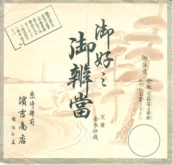 1926(大正15)年3月4日の調製と思われる、昔の糸崎駅弁の掛紙。この白砂青松の背景は、糸崎や瀬戸内海の風景か、あるいはイメージイラストか。左上の注意書きが切符型であることは、磁気券やICカードに自動改札の時代なると、解説が必要になってきたか。