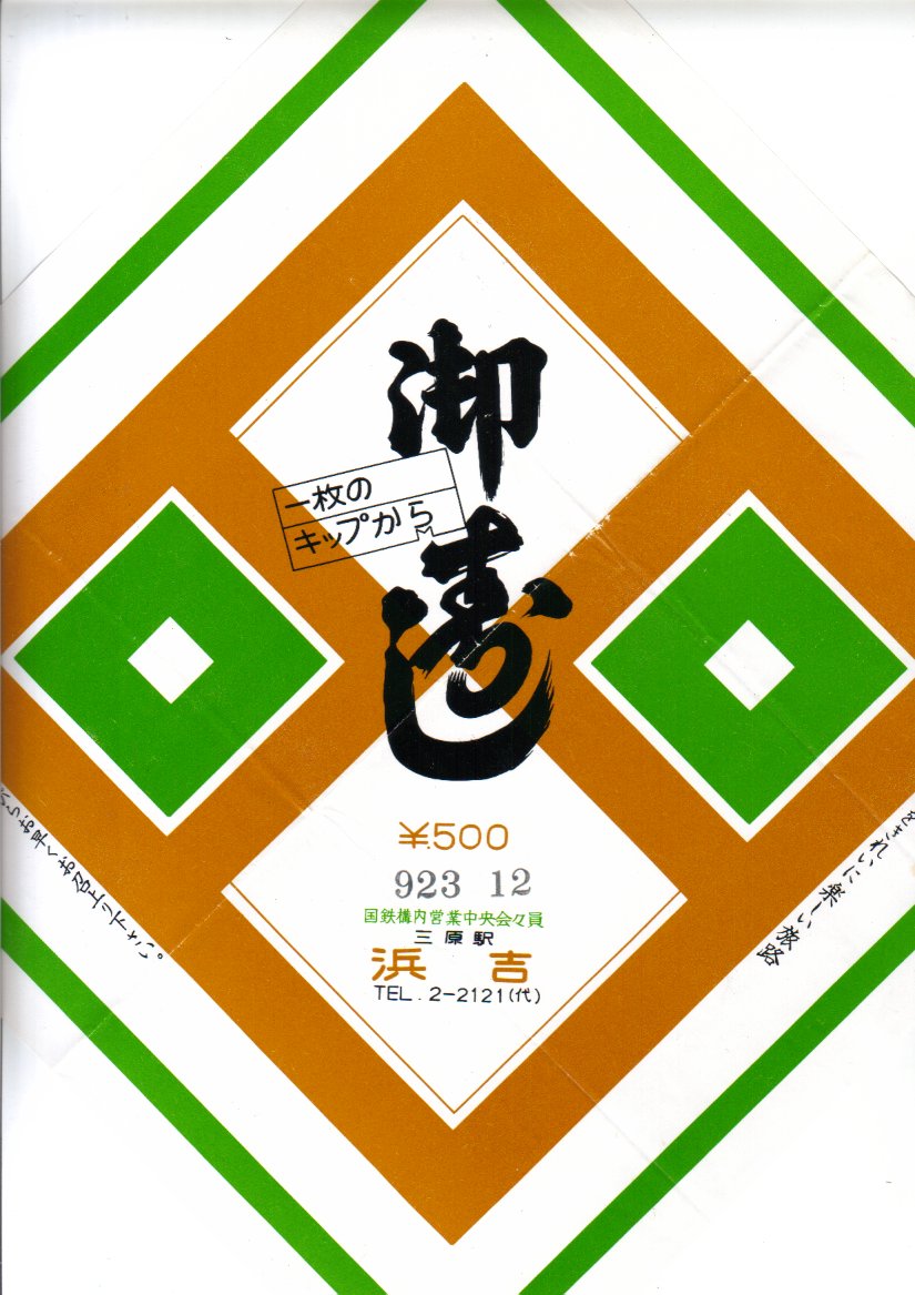 入手状況等から1977(昭和52)年の、掛紙から9月23日12時の調製と思われる、昔の三原駅弁の掛紙。掛紙のデザインに地域色はなく、中身は恐らく助六か何かであったのだろう。原版に手書きで追記したのか、当時の他の駅弁の掛紙と比較して、国鉄の旅行キャンペーン「一枚のキップから」ロゴマークの形状がだいぶ異なる。