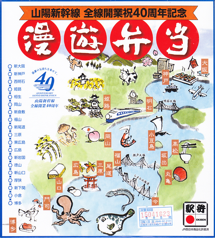 2015(平成27)年に使われたのではないかと思われる、福山駅弁のふた。同年の山陽新幹線全線開業40周年を記念して、新神戸、姫路、岡山、福山、広島、小倉、博多の各駅で10種類が誕生し、3月から6月まで売られた記念駅弁や復刻駅弁の、福山駅バージョン。2015年現在の停車駅と、瀬戸内海の地名や名物を描いたイラストを掲載した。中身は3個の俵飯、アナゴとタコ飯、フグやアナゴなどの焼き物と煮物だったそうな。現物に表記のない価格は、きっと1,050円。