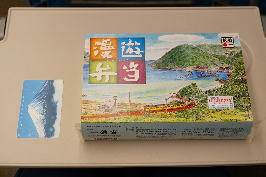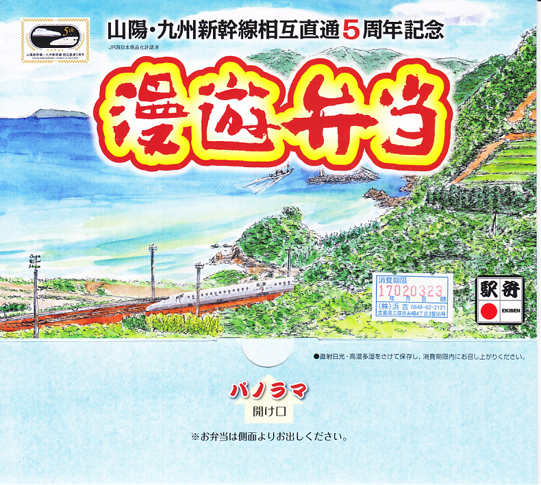この名前では2016(平成28)年3月に発売。発売時点で日本一よみがなの長い駅弁。福山駅の駅弁「漫遊弁当」について、山陽・九州新幹線の相互直通5周年を記念して、駅弁の名前とパッケージの絵柄をこれにちなんだ。ふたを開くと両新幹線や沿線の写真と路線図が現れるが、「パノラマ 開け口」の表記で期待したような、飛び出す絵本のようにはなっていない。