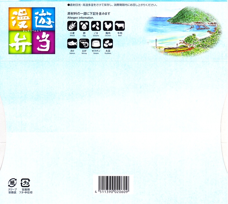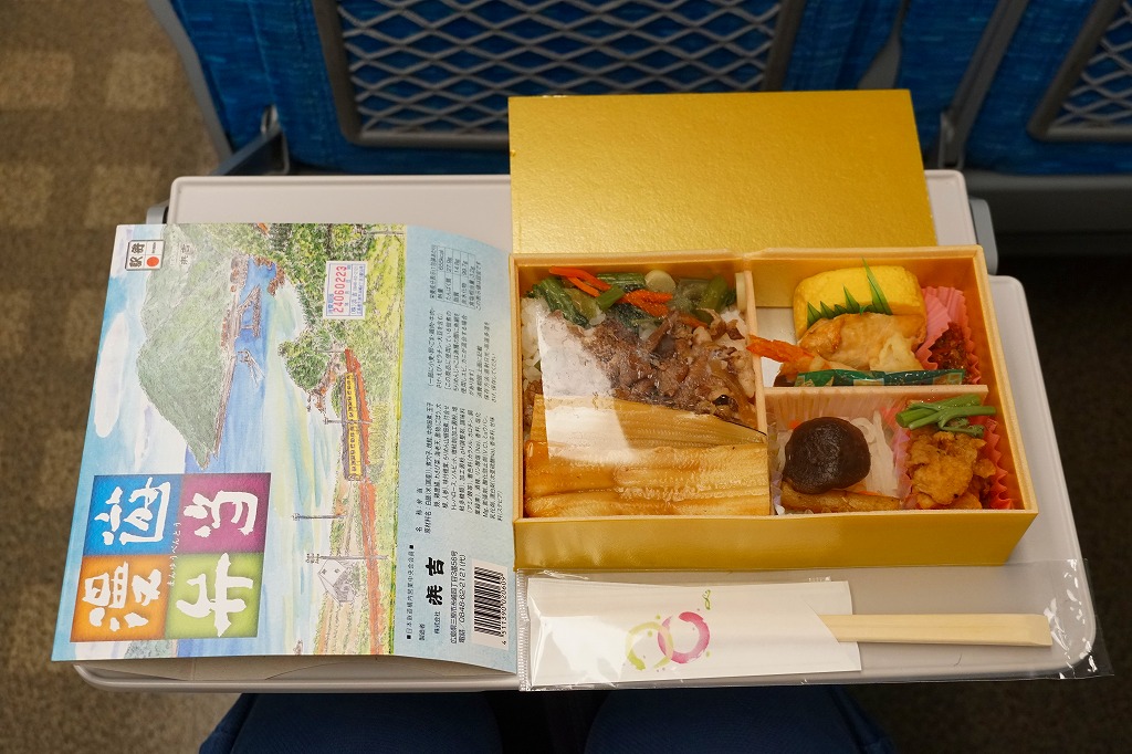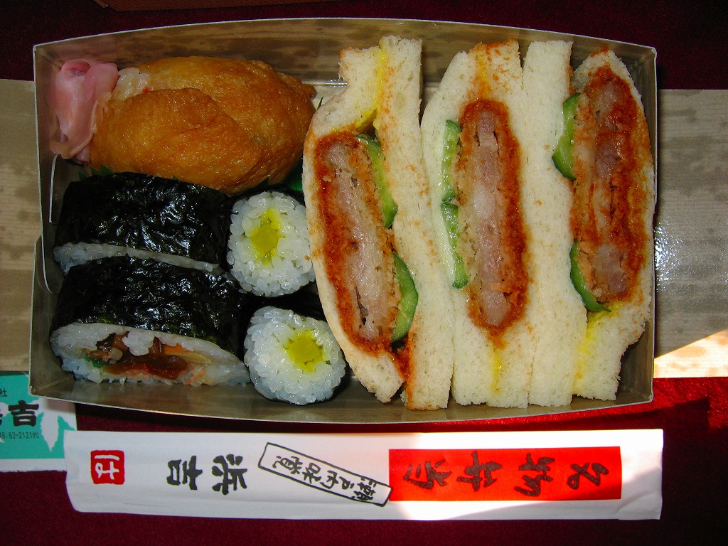 中身はアナゴとタイそぼろのちらし寿司、茶飯の俵飯3個、練り物やカボチャなどの煮物、牛肉や鮭などの焼き物などで、沿線の名物にちなんでいるようには見えない。一年間販売し、2017(平成29)年に元の漫遊弁当へ戻った。