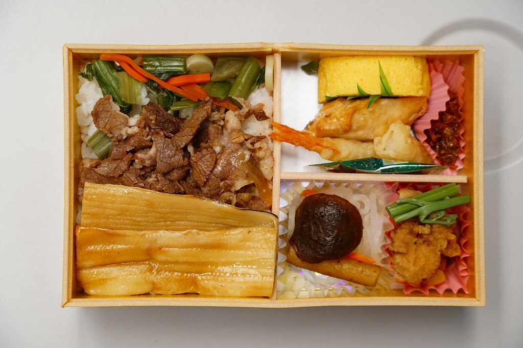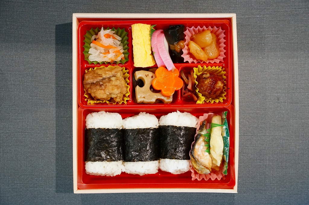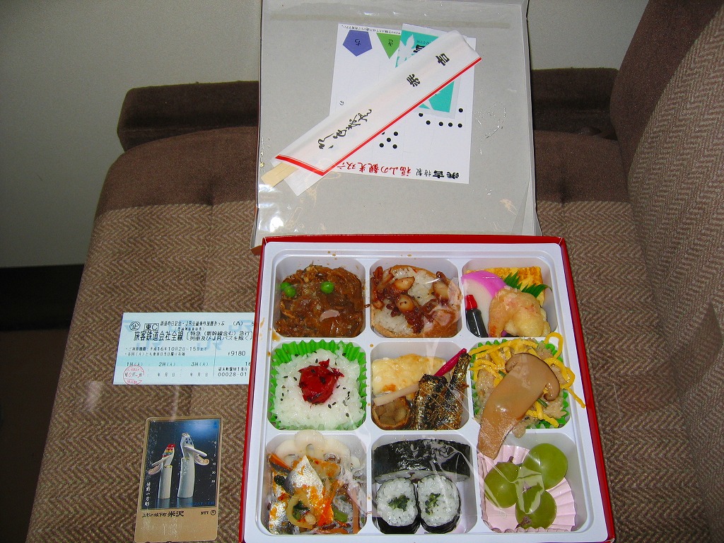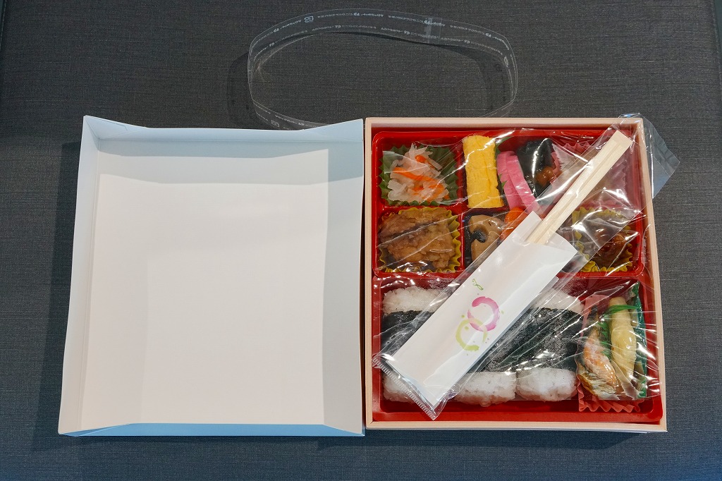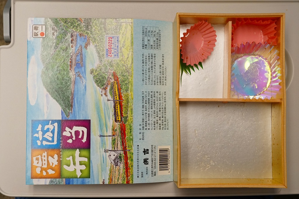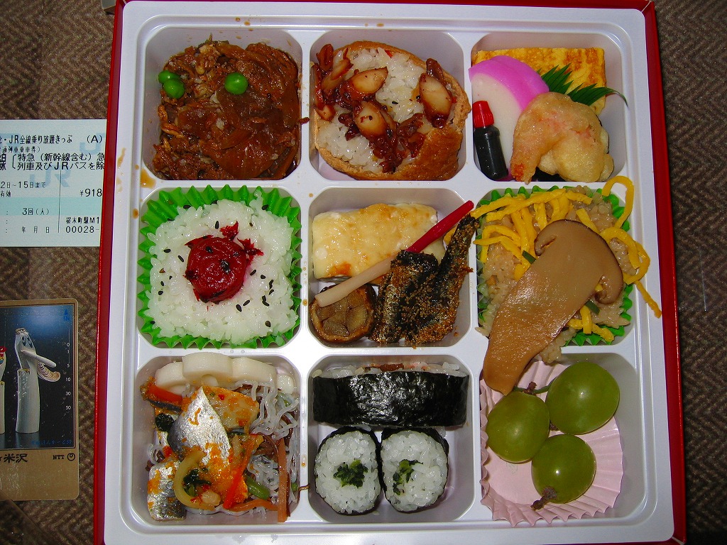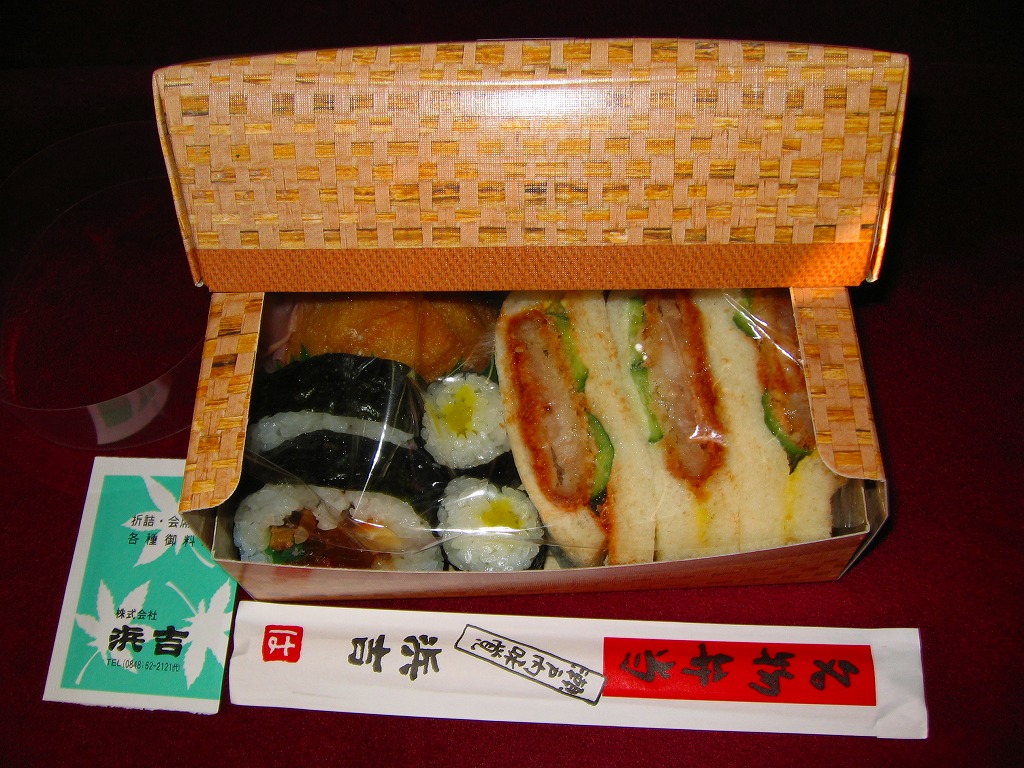 中身は九分割され、日の丸御飯に蛸いなりに松茸飯に太巻細巻と四種の御飯、牛肉旨煮やいわし旨煮にはまち塩焼やままかりなど四区画分のおかず、残る一区画はデザートに季節の果物。ふただけで駅弁の名前のすべてが語られるが、中身も秀逸で味も良く、それで人気があるためか毎日早めに売り切れている模様。