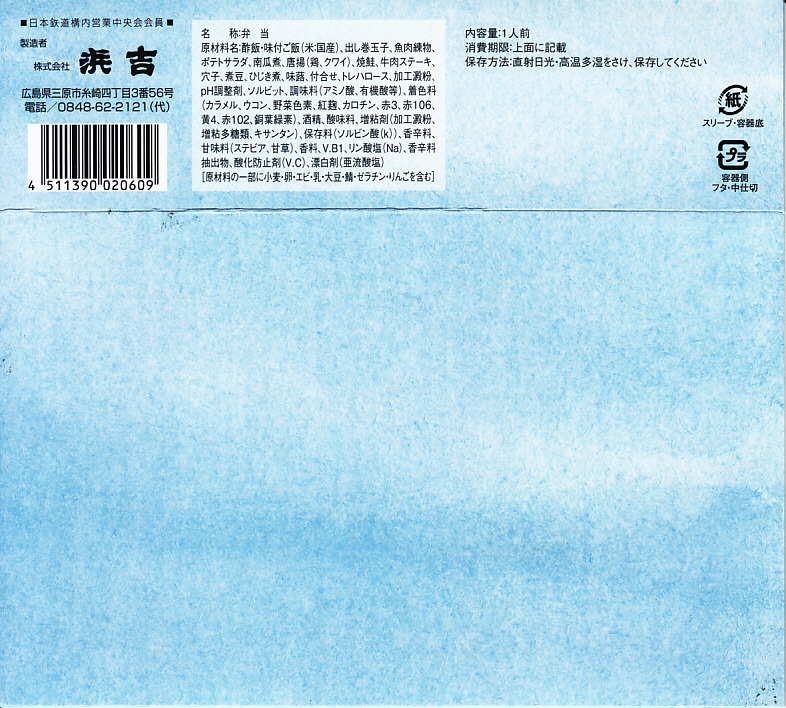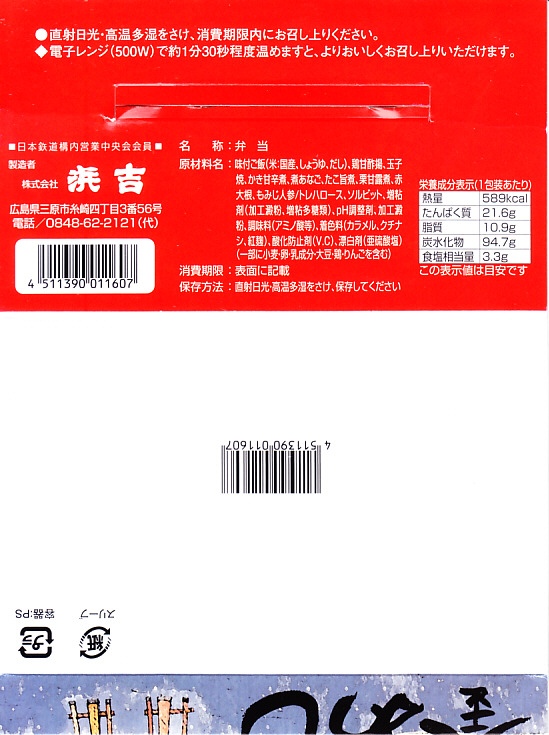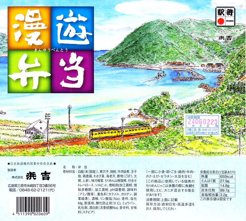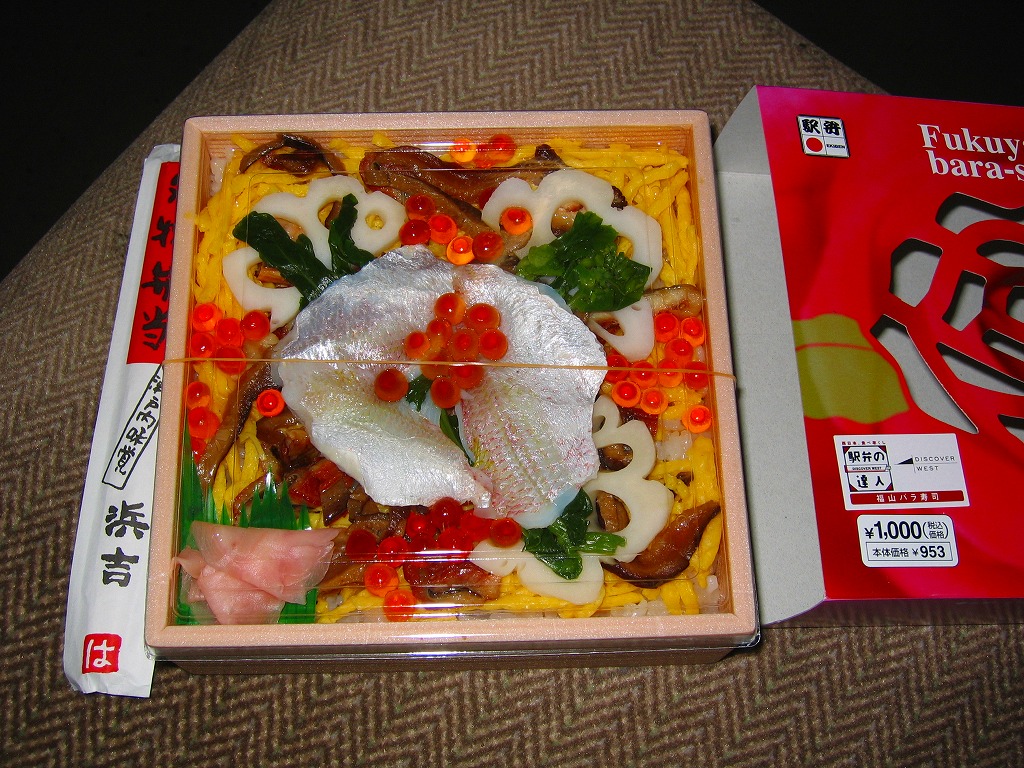 調製元は、2003年に福山駅へ進出した、三原駅の駅弁屋。三原より福山のほうが駅弁が売れるのか、駅弁の種類や新製品投入状況を見るとこちらがメインステージになっている模様。2004年度のJR西日本の駅弁キャンペーン「駅弁の達人」の対象駅弁。価格は2004年の購入時で1,100円、2016年時点で1,150円。2021年までの販売か。