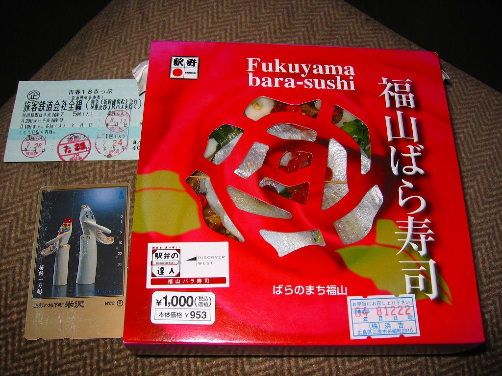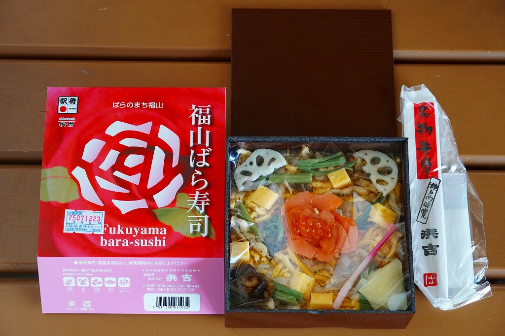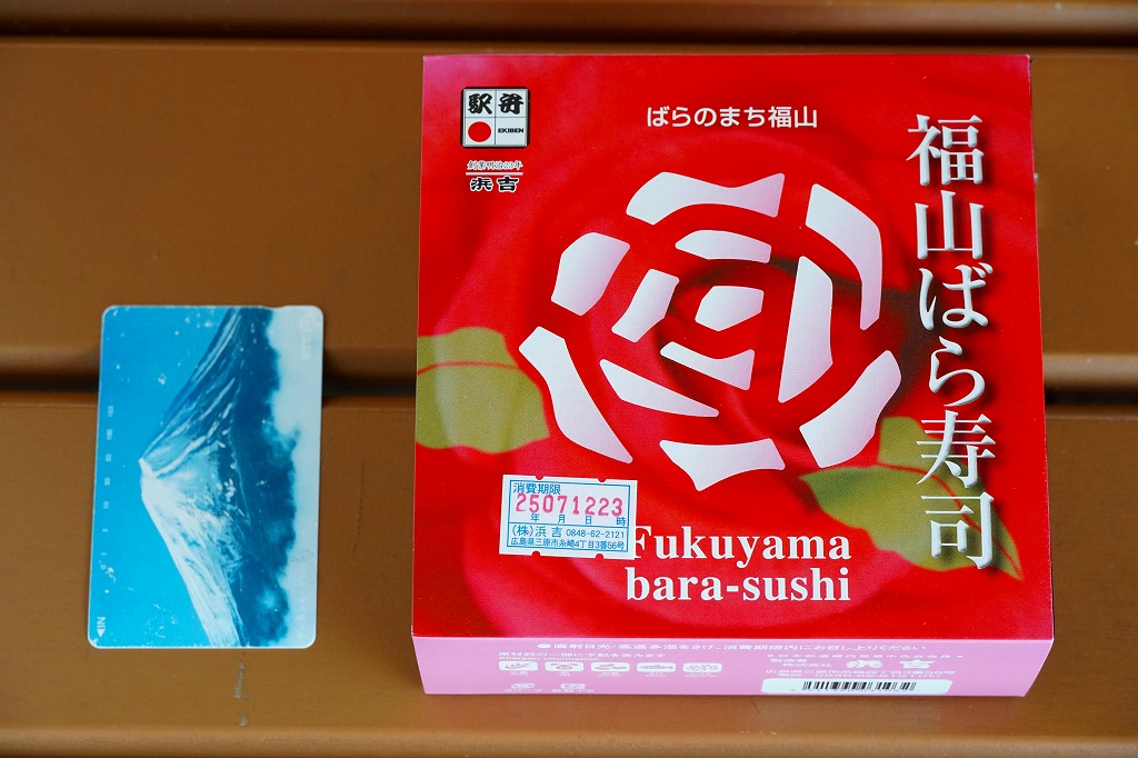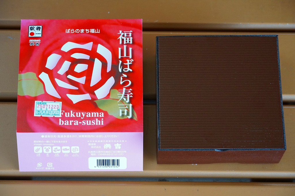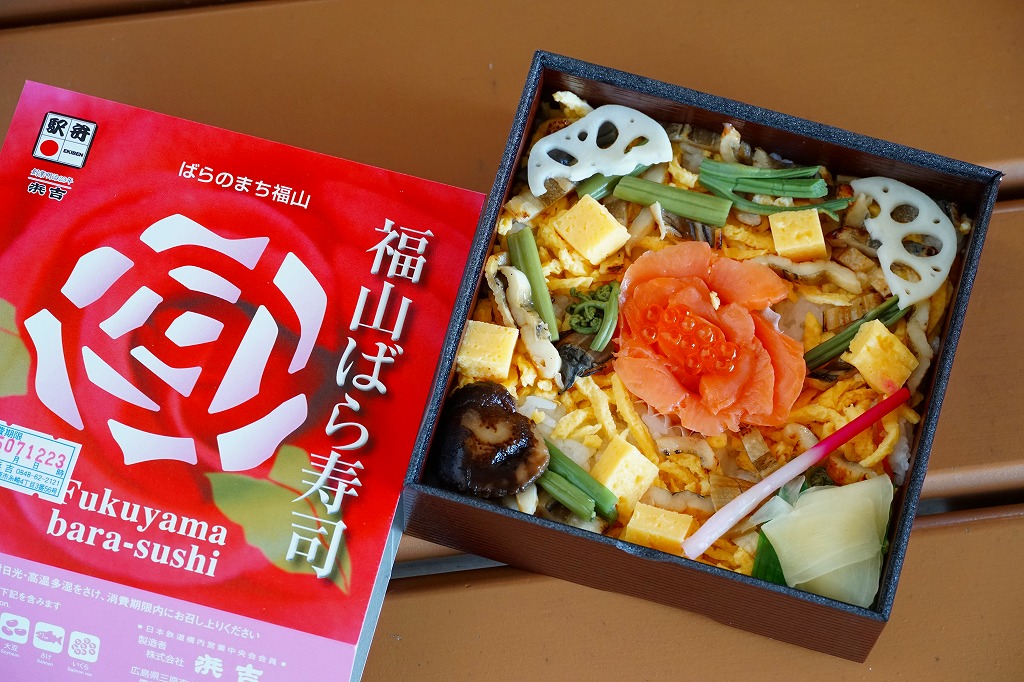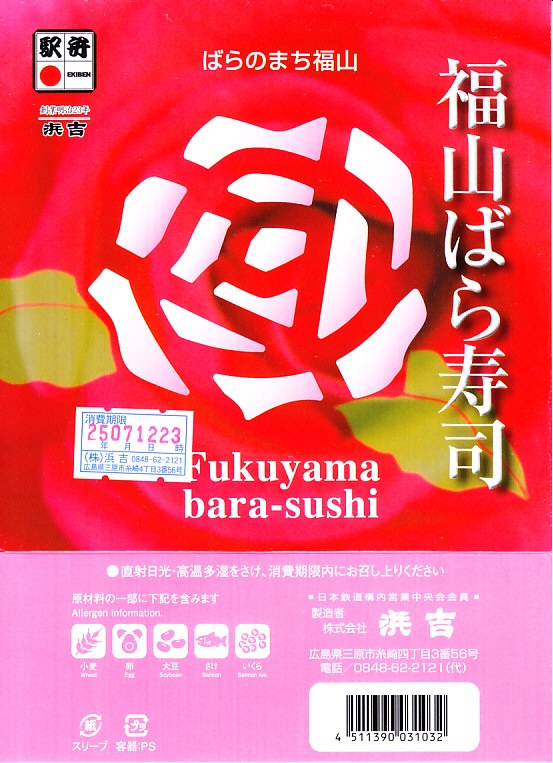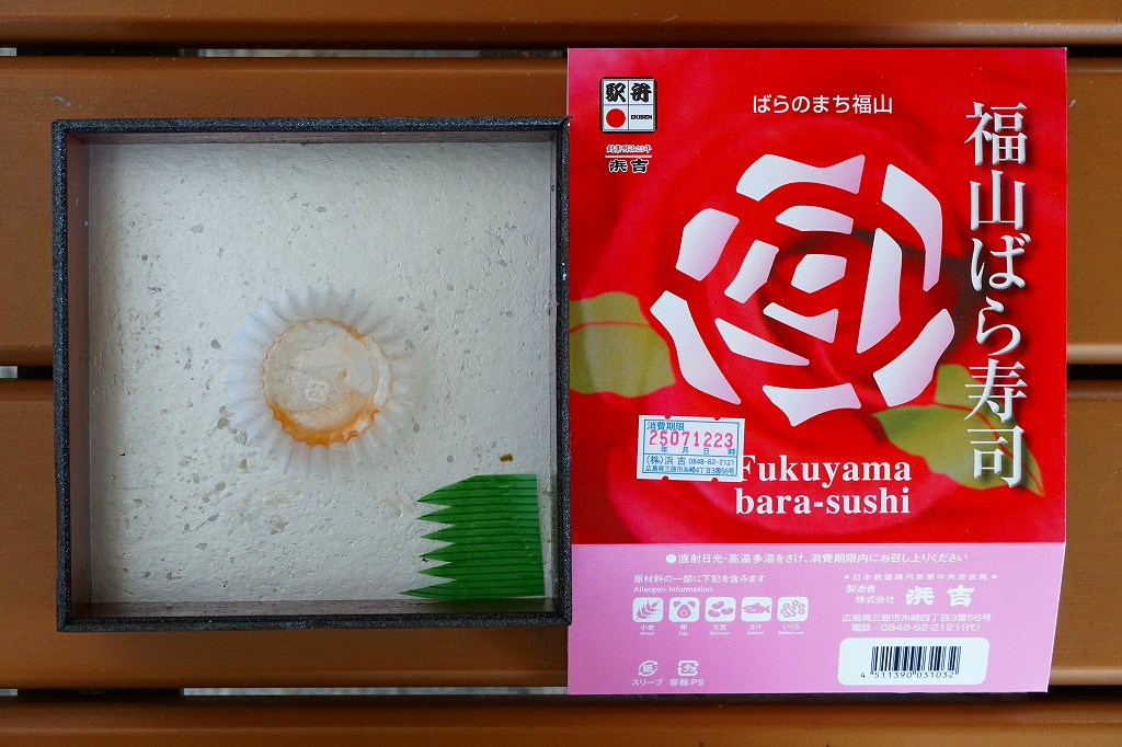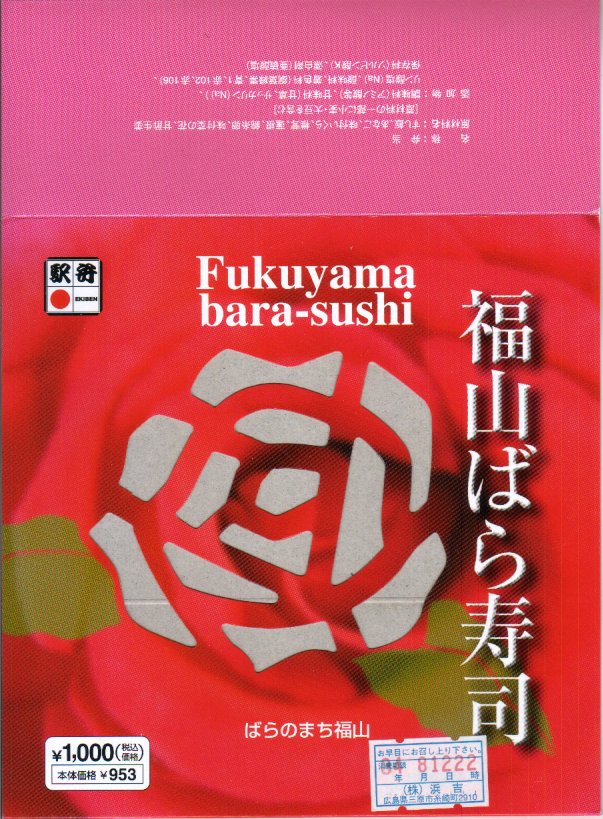 JRダイヤ改正により福山駅に新幹線のぞみ号が停車するようになったことを記念して、2003(平成15)年10月1日に発売したというが、その数か月前から売られていた模様。福山市の市の花であるバラがテーマになっていて、駅弁の名前や、「ばらのまち福山」と書かれたスリーブの色や絵柄に反映される。