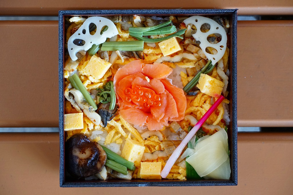 黒い正方形の容器に、酢飯を詰め、錦糸卵で覆い、刻んだ焼穴子と山菜を散らし、れんこん、しいたけ、ガリ、はじかみを添え、真ん中でサーモンをバラの花のように組み立ててイクラをトッピングし、サイコロ状の玉子焼きで囲う。中身にバラは入っていないが、視覚でバラが反映された、表情豊かなちらし寿司。