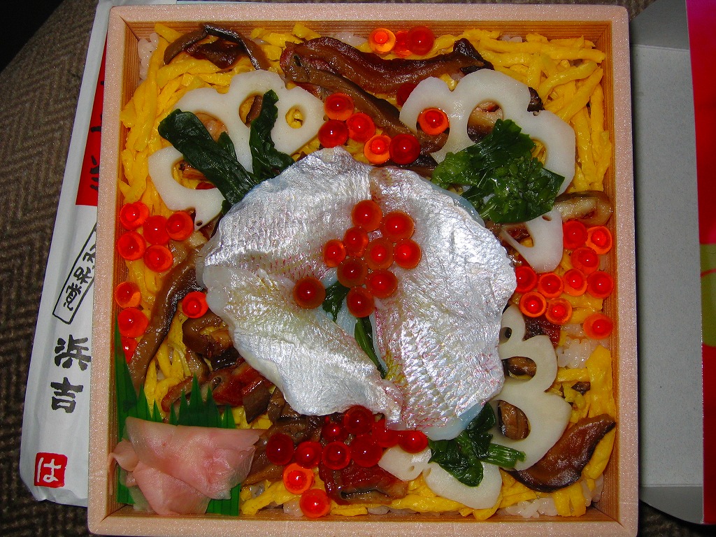 上記の駅弁「福山ばら寿司」の、2004(平成16)年時点での姿。売り場での見た目は、上記の2025年のものと変わらないようにみえる。当時のスリーブは中身が少し見えるよう、バラの花びらの部分がくり抜かれていたほか、中身でバラを象った魚の身がサーモンでなく小鯛の酢漬けだった。