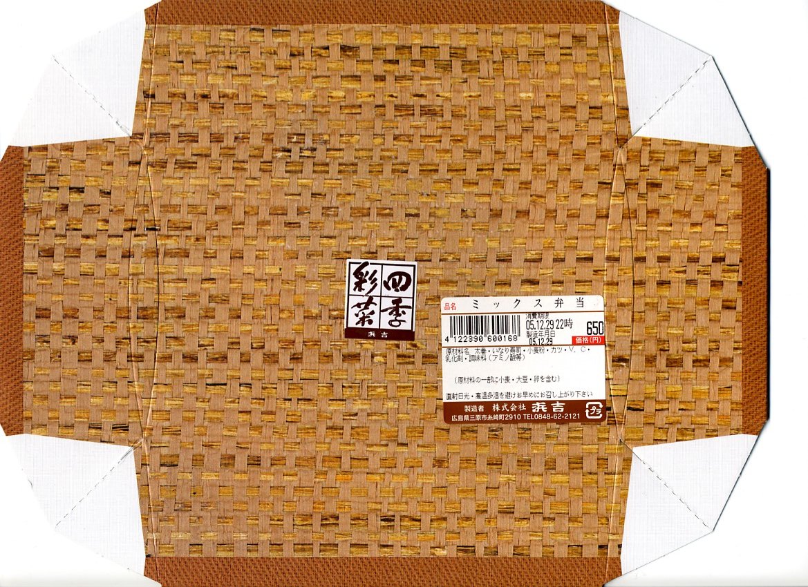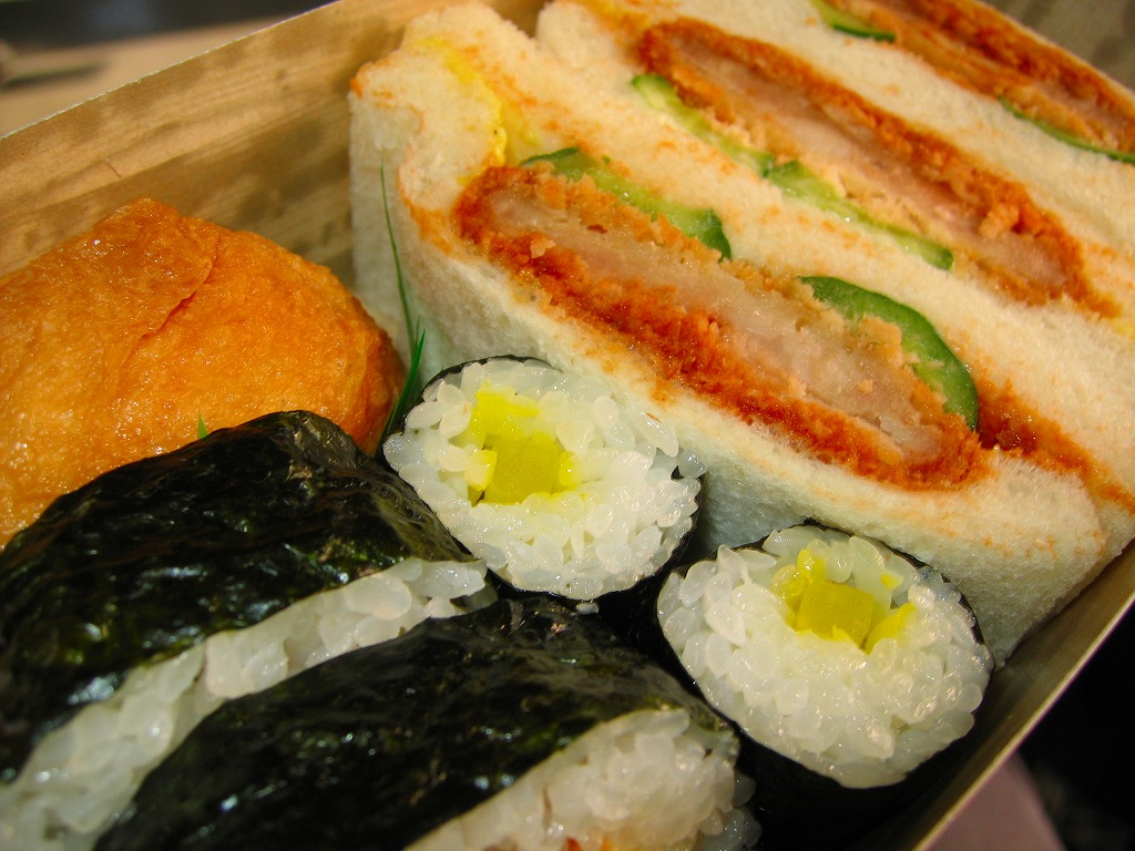 軽食用な竹編み柄のボール紙容器をプラ帯で留める。中身はキュウリとトンカツのサンド、タクアンの細巻、カンピョウの太巻という、不思議な構成のランチボックス。ここが街の弁当屋としても活躍していることを示す証拠品か。以後に見たことがなく、収穫報告もなく、現存しない模様。
