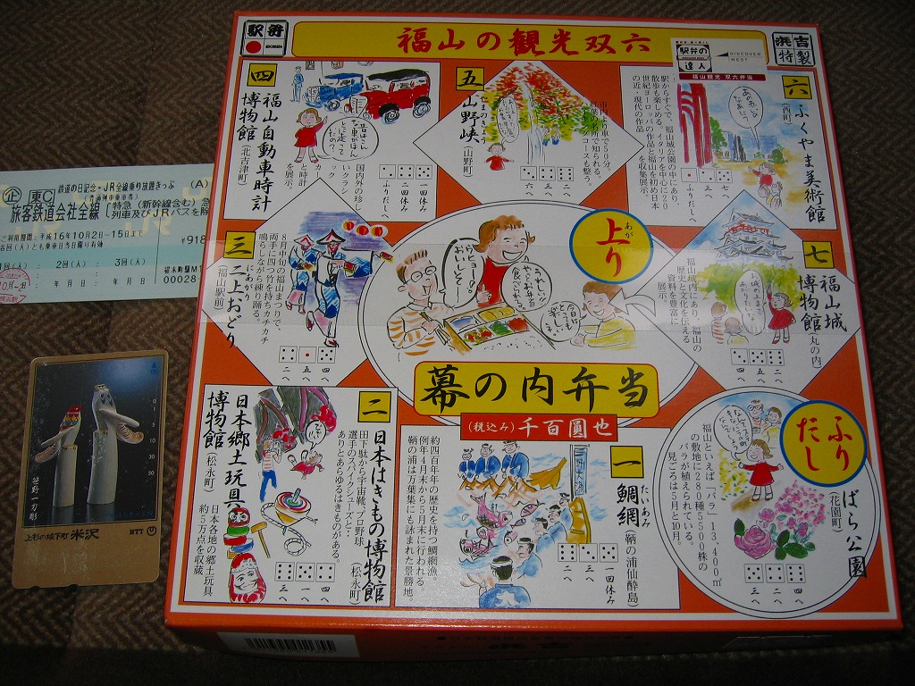 JRダイヤ改正による福山駅の新幹線「のぞみ」停車を記念して、2003(平成15)年10月1日に発売。正方形のボール紙容器のふたに福山の観光名所を巡る双六を印刷、その裏には組立式のサイコロとコマが挟み込まれている。