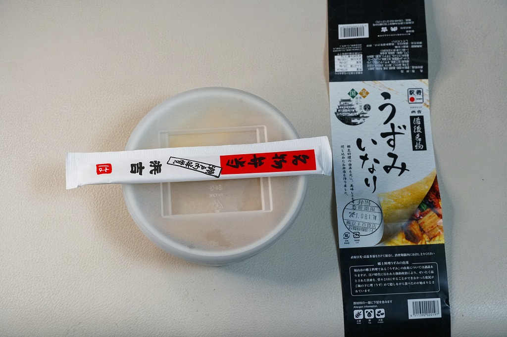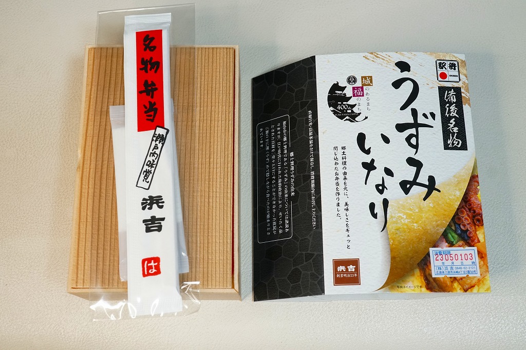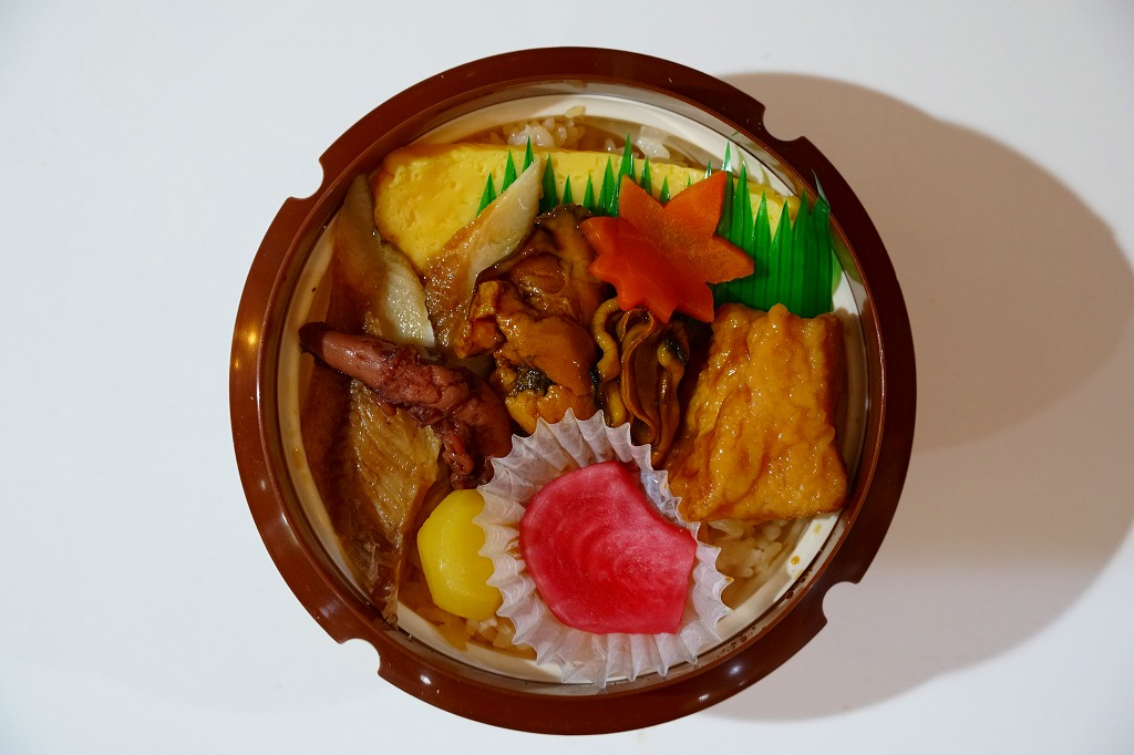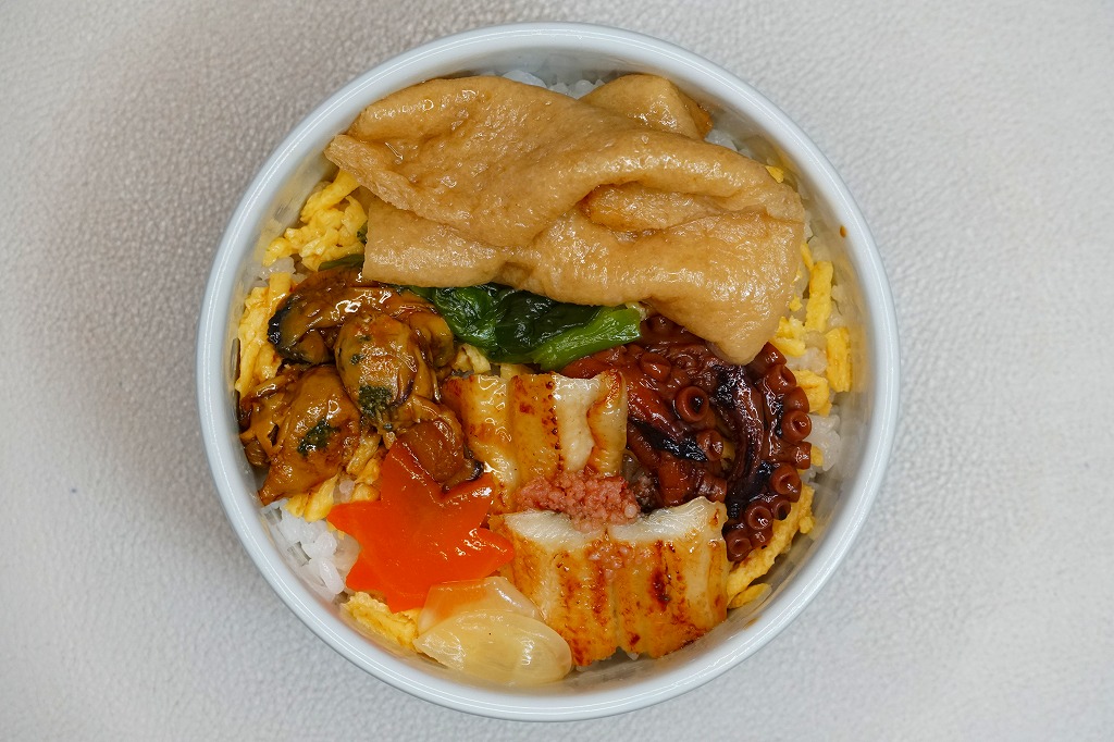 商品名を大きく書いて、中身を知りにくい絵柄のスリーブに収めた長方形の容器を引き出してふたを開けると、酢飯を油揚げで覆った中身が見える。この油揚げをめくると、タコ煮、焼穴子、カキ煮、でんぶ、錦糸卵、ガリなどの具が出現。これは東京で評判となった新潟の駅弁「えび千両ちらし」と同じ演出で、何年か後には大阪で評判の駅弁となれるだろうか。油揚げのおかげで出汁の水気と風味が豊かな、柔らかい味のお弁当。価格は2022年の発売時で1,200円、2025年時点で1,300円。