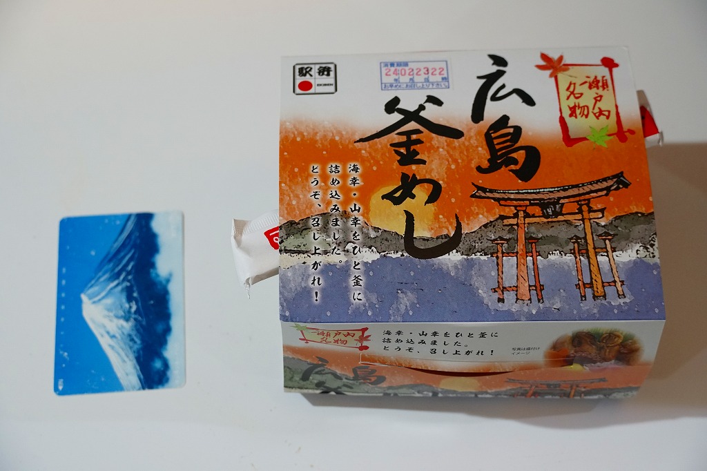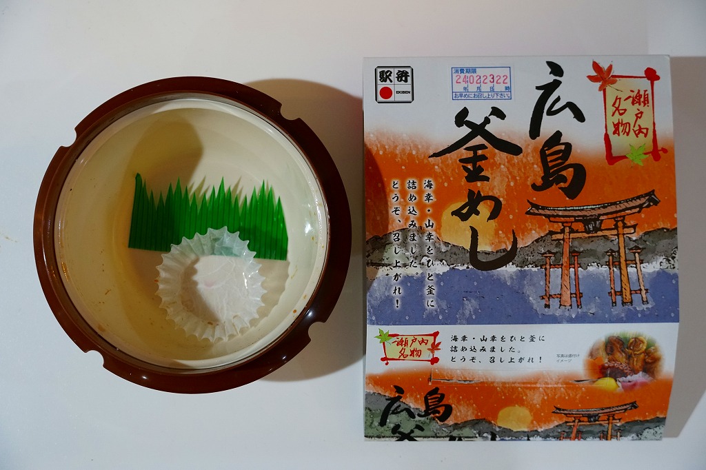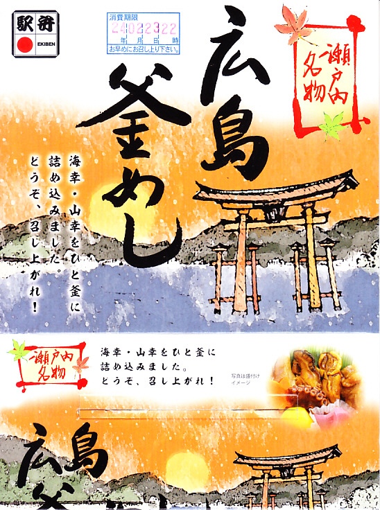 秋冬の駅弁大会シーズンに向けた、2020(令和2)年秋の新商品か。宮島を描いたスリーブに収めたプラ製の釜型容器に、茶飯を詰め、鶏肉の甘酢漬、かきの甘辛煮、煮あなご、たこの旨煮、玉子焼、くり、もみじ型にんじん、赤大根で覆う。現地でなく催事で売られる商品だろうが、具を眺めると広島や瀬戸内を感じられるし、それらの具は福山駅の駅弁にも入っているため、現地へ行かずとも旅気分を味わえる駅弁として優れるのかも。価格は2020年の発売時で1,080円、2022年時点で1,130円、2023年時点で1,150円、2024年時点で1,250円。2024年までの販売か。