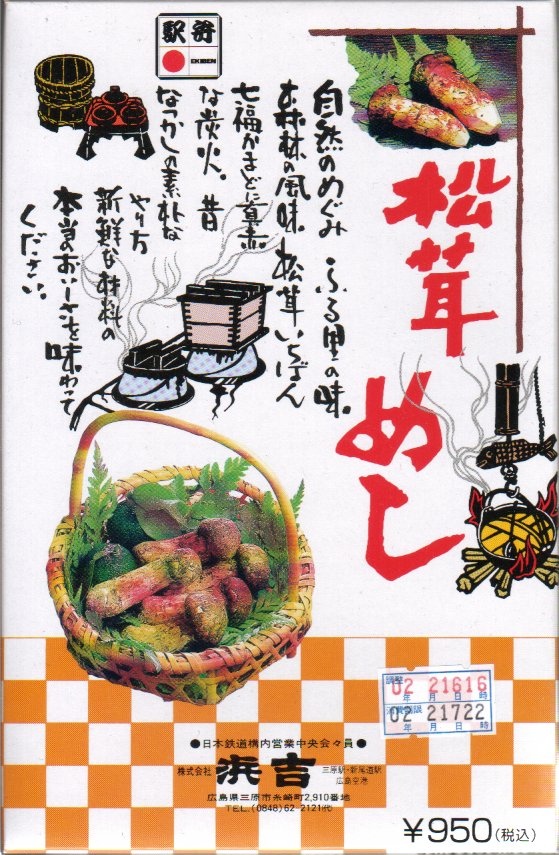 釜を模したプラ容器の中身は、醤油御飯の上に駅弁の名前にもある松茸はもちろん、栗に山菜に紅葉型蒲鉾に付け合わせ、そして椎茸になんとマッシュルームが載る、釜飯風駅弁。薄い釜にボール紙を立体にし強度を付けたふたという具合の、廃棄物減量型容器。駅弁業者の倒産により2003年1月14日限りで失われた。