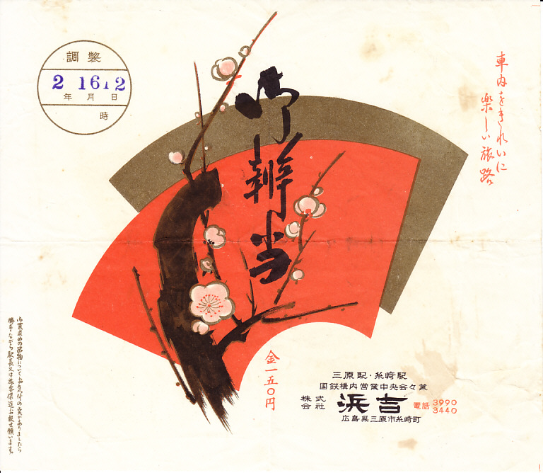 1960年代のものと思われる、昔の三原駅弁の掛紙。おそらく梅花を描く。現在の三原市域には、満汐梅林という梅の名所があるが、これは地域と関係なく一般的な絵柄を描いたのではないかと思う。