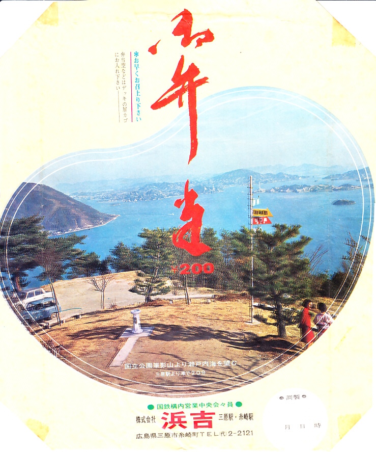 1970(昭和45)年に使用されたのではないかと思われる、昔の三原駅弁の掛紙。同年の大阪万博の文字とロゴを記し、瀬戸内海国立公園の写真を使う。今から見れば、山や島の斜面が削られた傷跡が痛々しい。この地域ではこの頃まで、温州みかん畑が盛んに造成されたが、豊作と過剰生産にグレープフルーツやオレンジの輸入自由化でみかんの価格が暴落し、畑が放置されるようになる。