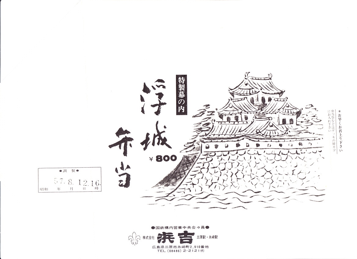 1982(昭和57)年8月12日16時の調製と思われる、昔の三原駅弁の掛紙。白紙に墨絵の三原城というこの絵柄は、上記の21世紀の現行のものと変わらない。