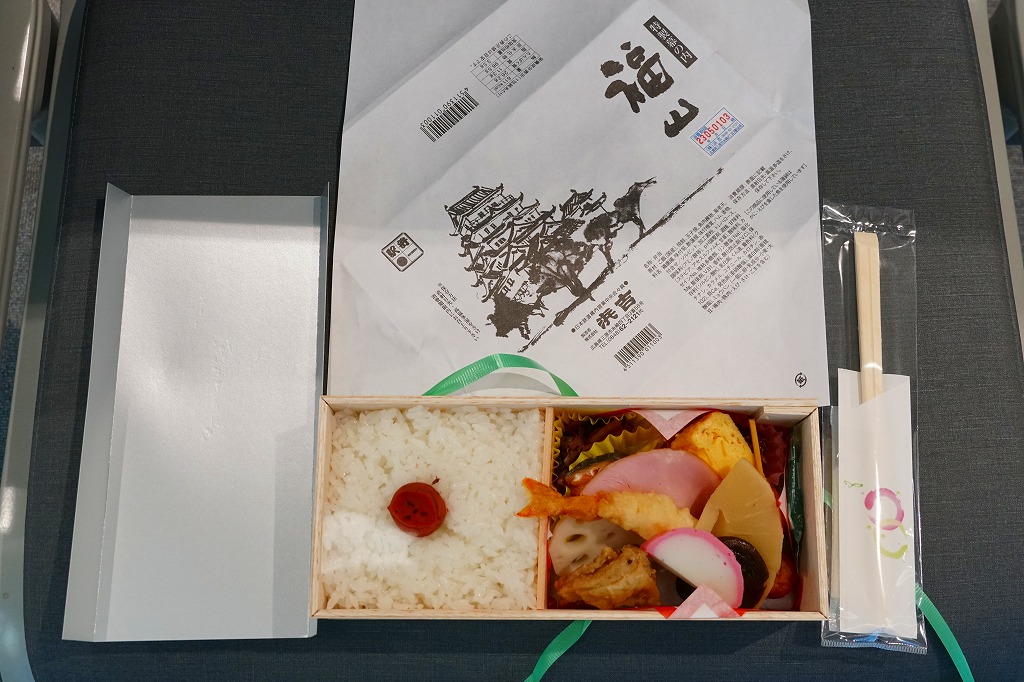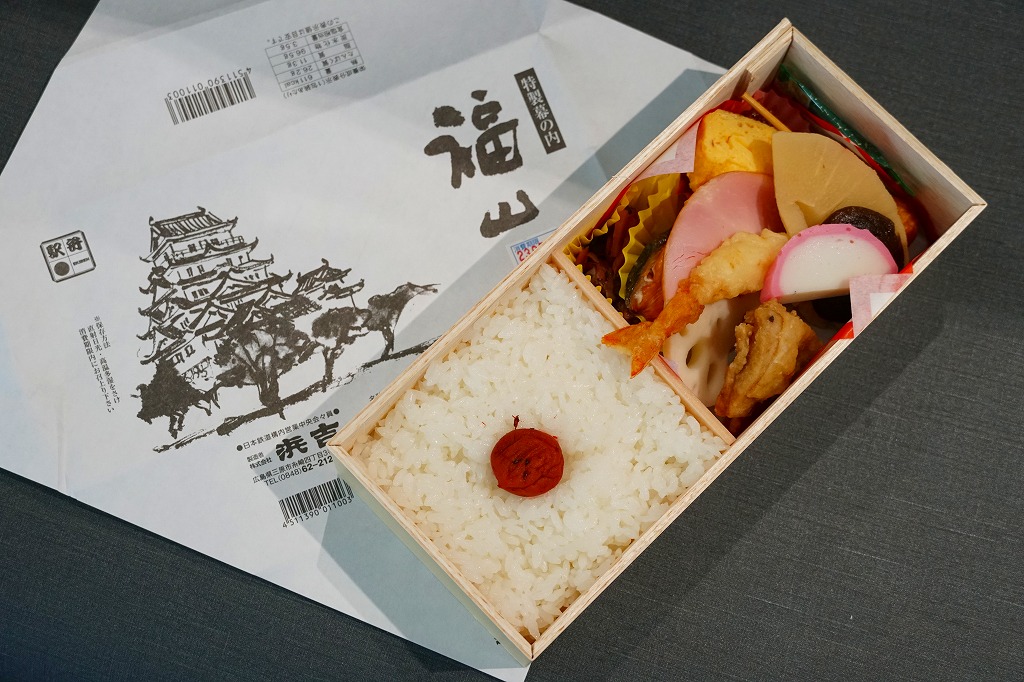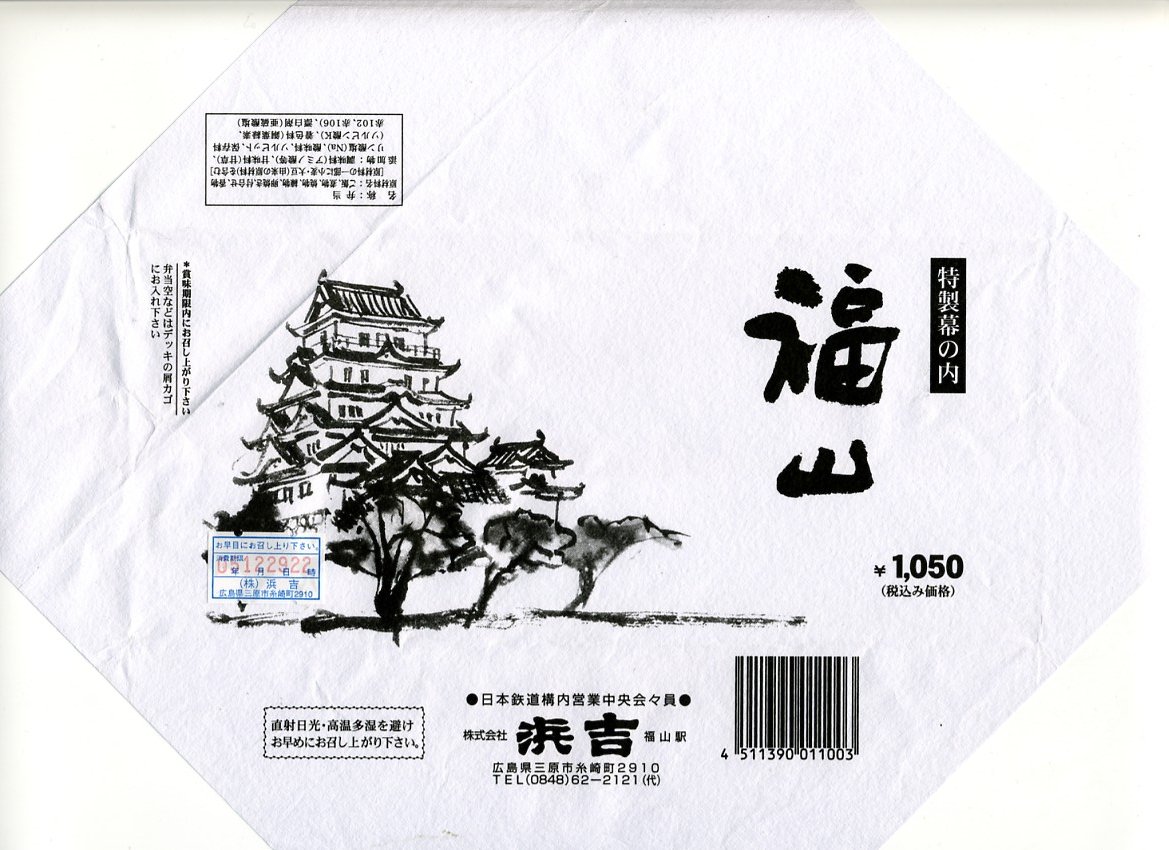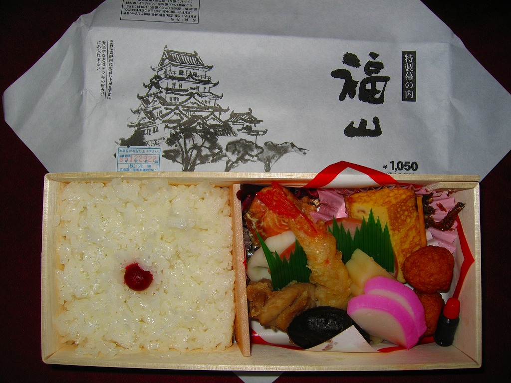 2003年に三原駅の駅弁屋が福山駅へ進出してから、ほどなく発売か。底が深い長方形の経木枠の容器に木目柄のボール紙でふたをして、福山城を描いた単色の掛紙をかけて、ビニールひもでしばる。中身は日の丸御飯に焼鮭・蒲鉾・玉子焼とエビフライ、練り団子、鶏肉、椎茸、ハムなどのおかず。つまり幕の内駅弁で、中身に特段の豪華さは無いはずが、詰め方と見せ方で、まるで正月の記念駅弁のような印象。価格は2005年時点で1,050円、2015年時点で1,100円、2023年5月から1,250円。