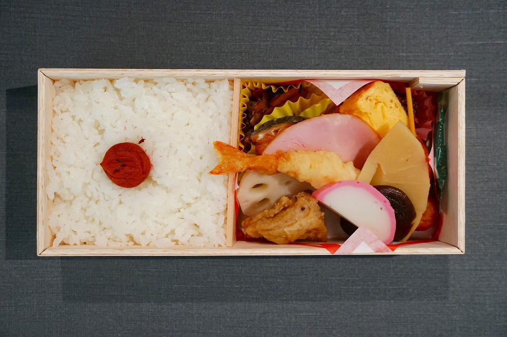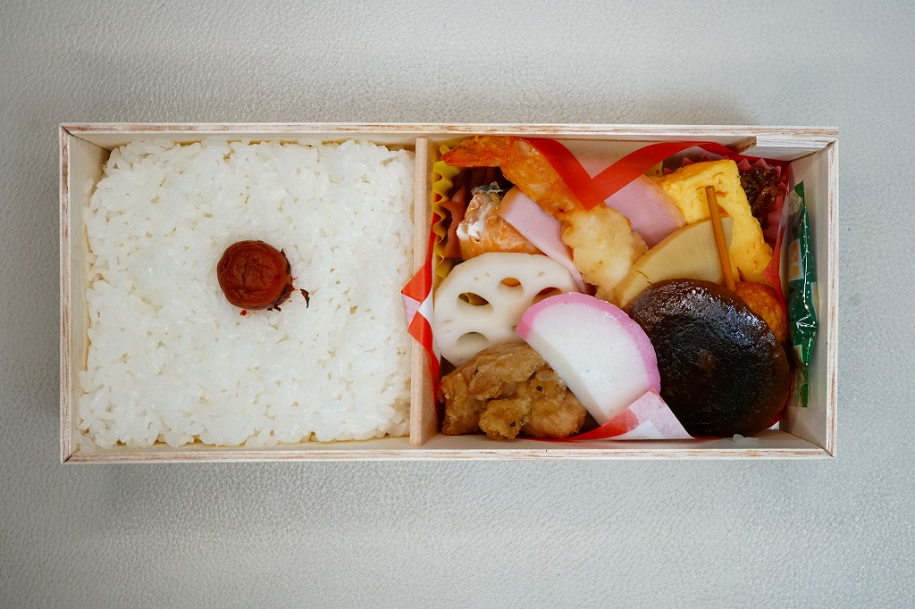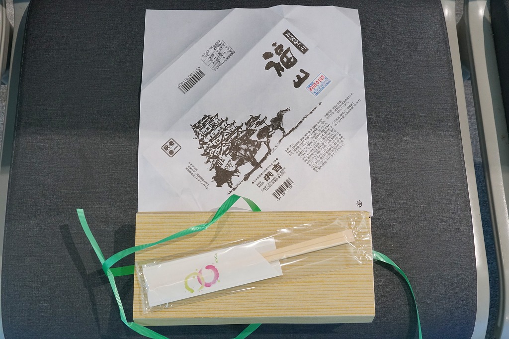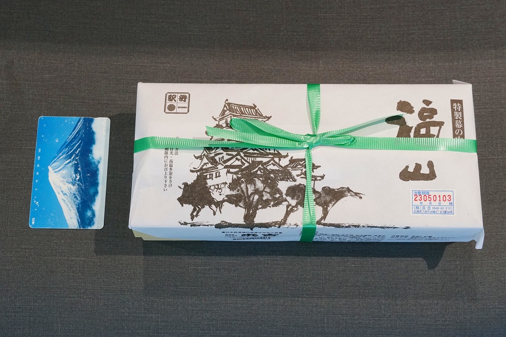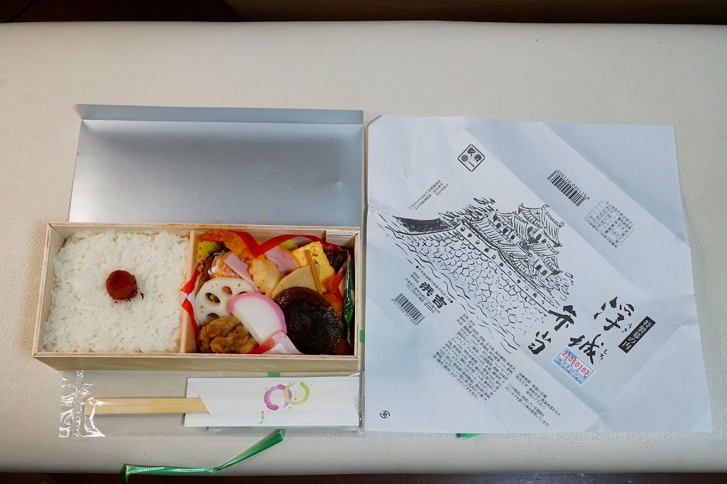 2003年に三原駅の駅弁屋が福山駅へ進出してから、ほどなく発売か。底が深い長方形の経木枠の容器に木目柄のボール紙でふたをして、福山城を描いた単色の掛紙をかけて、ビニールひもでしばる。中身は日の丸御飯に焼鮭・蒲鉾・玉子焼とエビフライ、練り団子、鶏肉、椎茸、ハムなどのおかず。つまり幕の内駅弁で、中身に特段の豪華さは無いはずが、詰め方と見せ方で、まるで正月の記念駅弁のような印象。価格は2005年時点で1,050円、2015年時点で1,100円、2023年5月から1,250円。