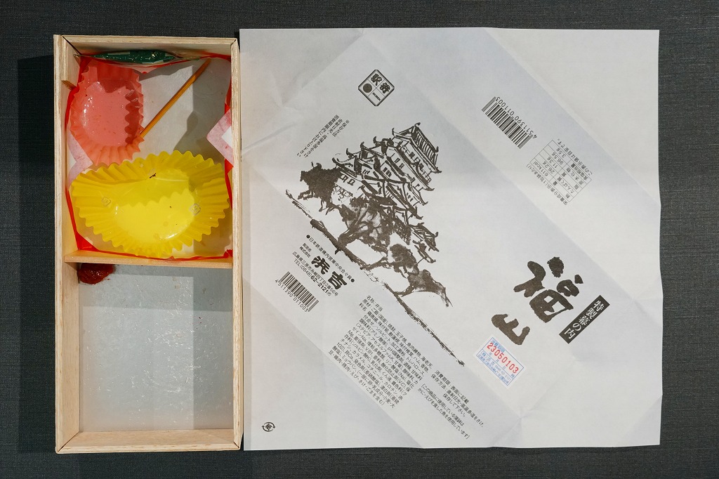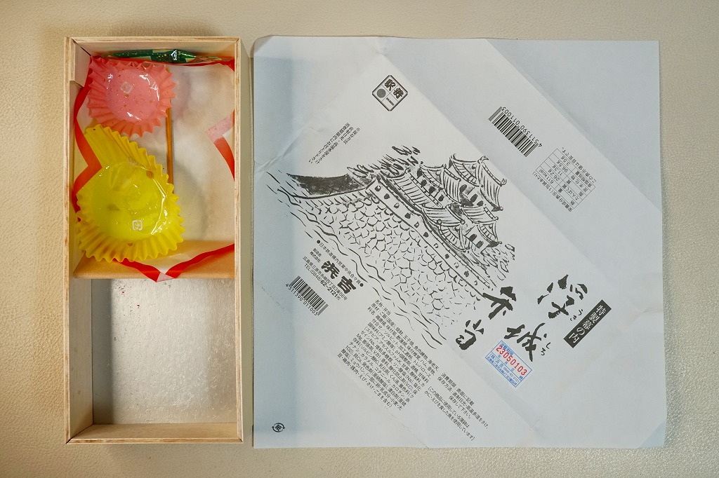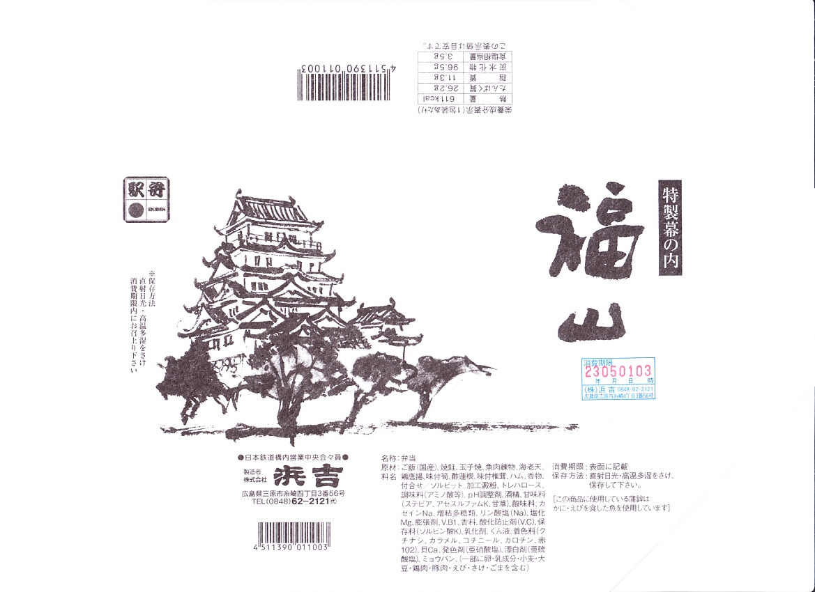 2005(平成17)年12月29日に購入した、福山駅弁の掛紙。描かれているものは、上記の2023年のものと同じ。値段の表記、食品表示、調製元の住居表示などの差異に、約20年の変化を感じる。容器と中身も同じ。