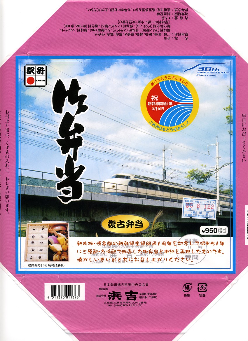 山陽新幹線博多開業30周年を記念して、2005(平成17)年1月23日から9月30日まで販売された、沿線12駅10駅弁業者による「復刻!懐かしの駅弁」シリーズのひとつ。1976年に三原駅で販売された500円の記念駅弁を、福山駅弁扱いで復刻したという。