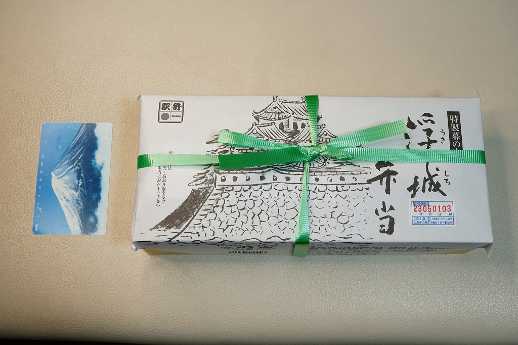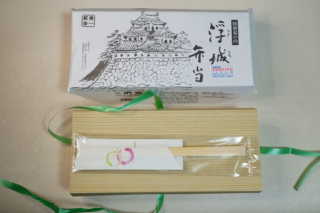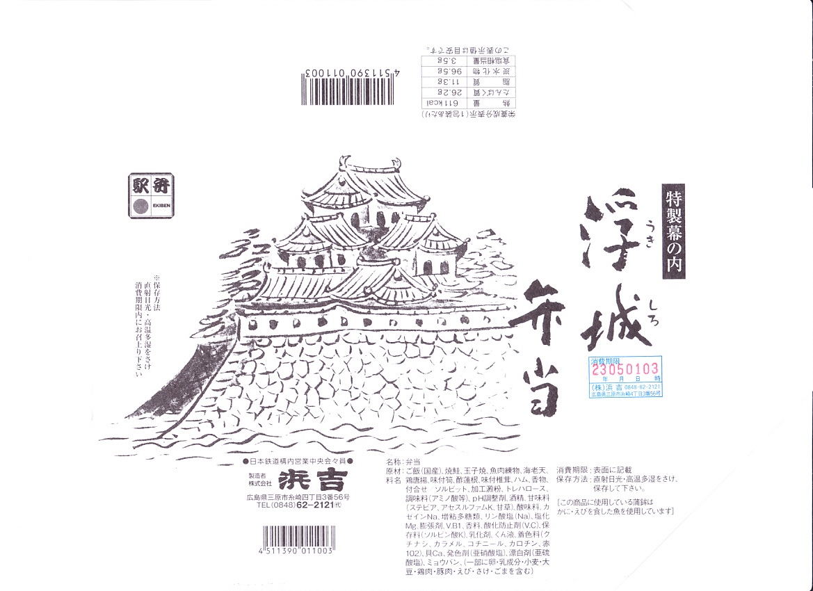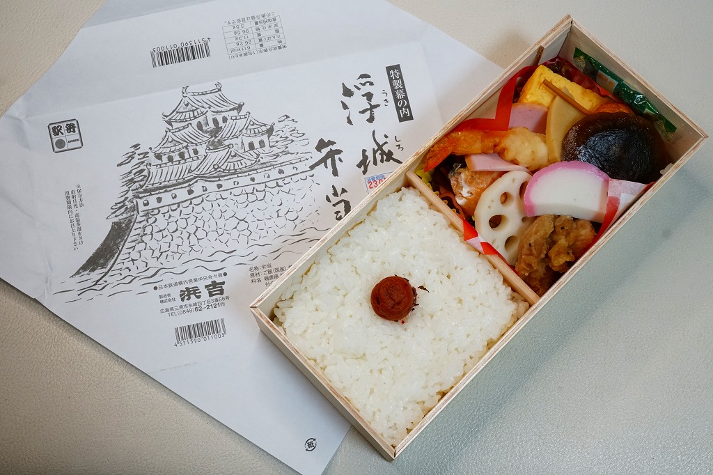 昭和50年代に三原駅で発売。今もこの駅弁は、福山駅でなく三原駅で売られることになっている。白い掛紙には三原城を描く。戦国時代の16世紀後半に小早川隆景が海を埋め島をつなぎ築いた海城は、満潮時に海に浮かんだように見えたことから「浮城(うきしろ)」の呼び名が付き、この駅弁の名前とする。三原城は明治維新で廃城後に鉄道駅の敷地となり、今の三原駅との縁があるほか、残された一部の石垣が駅の下や前に位置する。