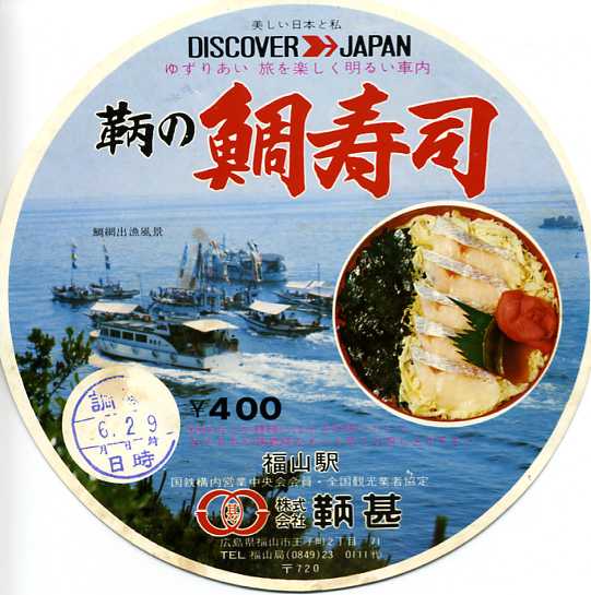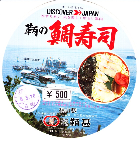 1976(昭和51)年8月3日の調製と思われる、昔の福山駅弁の掛紙。下記のものと同じ絵柄の、価格をシールで訂正した。鯛網出漁風景の写真に加えて、中身の写真も掲載するため、その内容が2003年の終売まで変わらなかったことがわかる。
