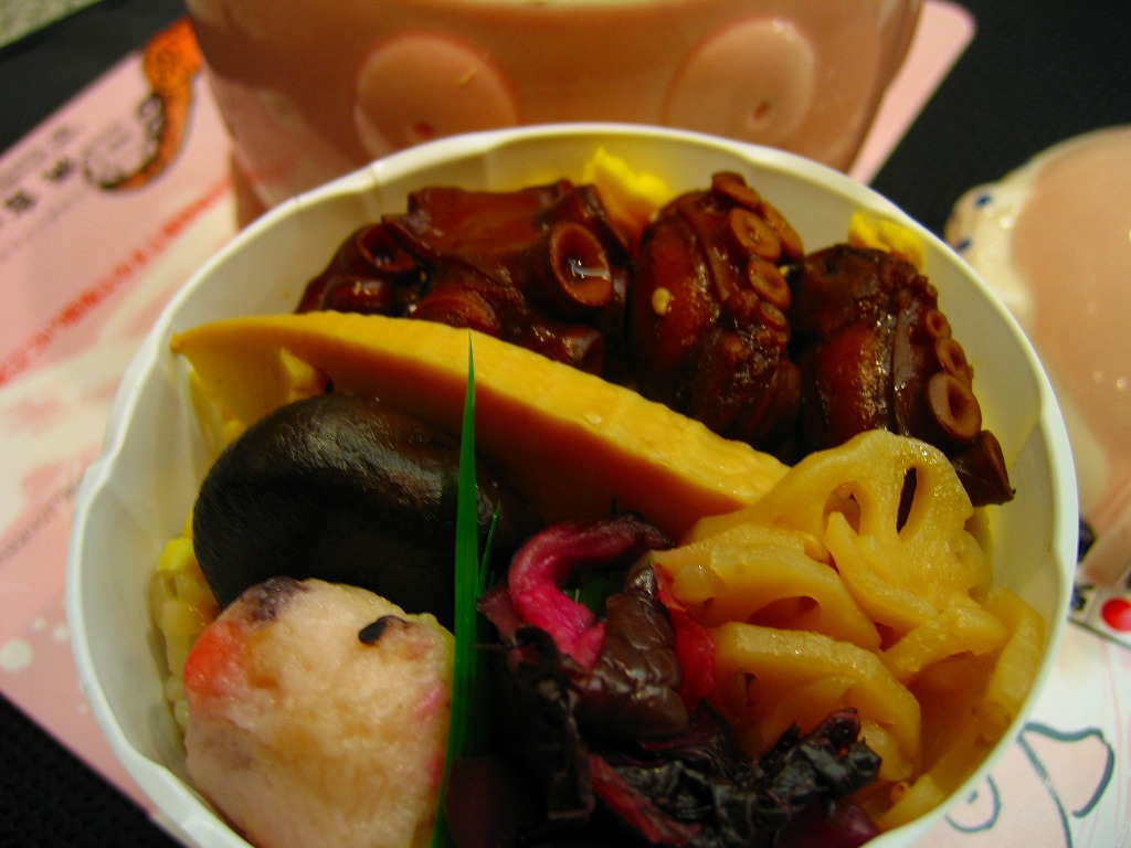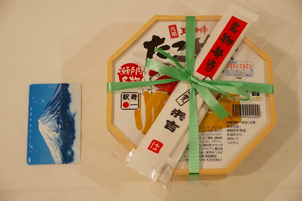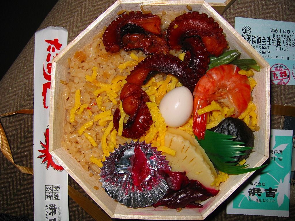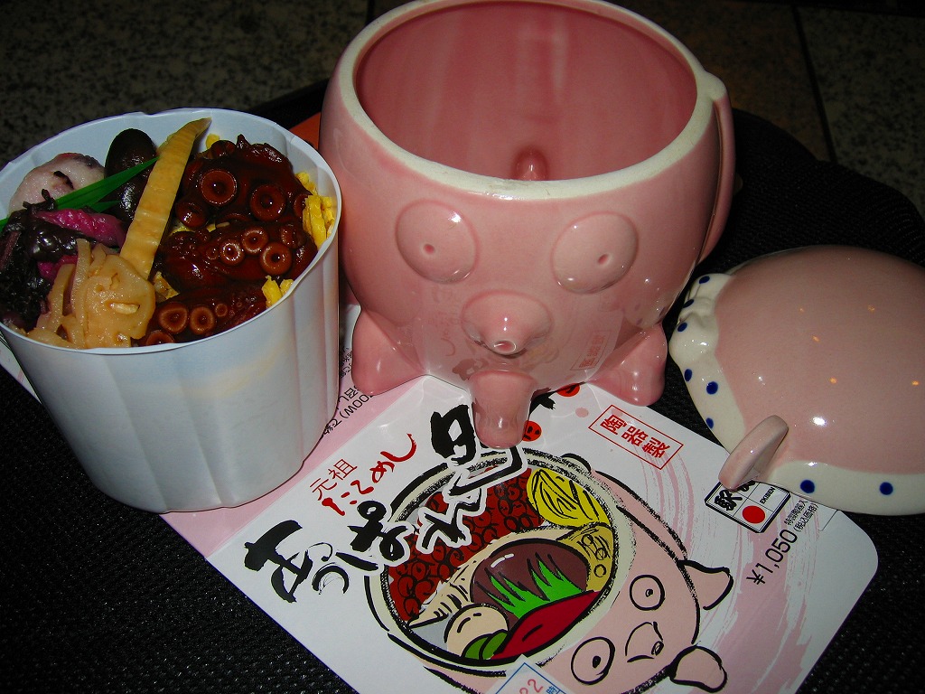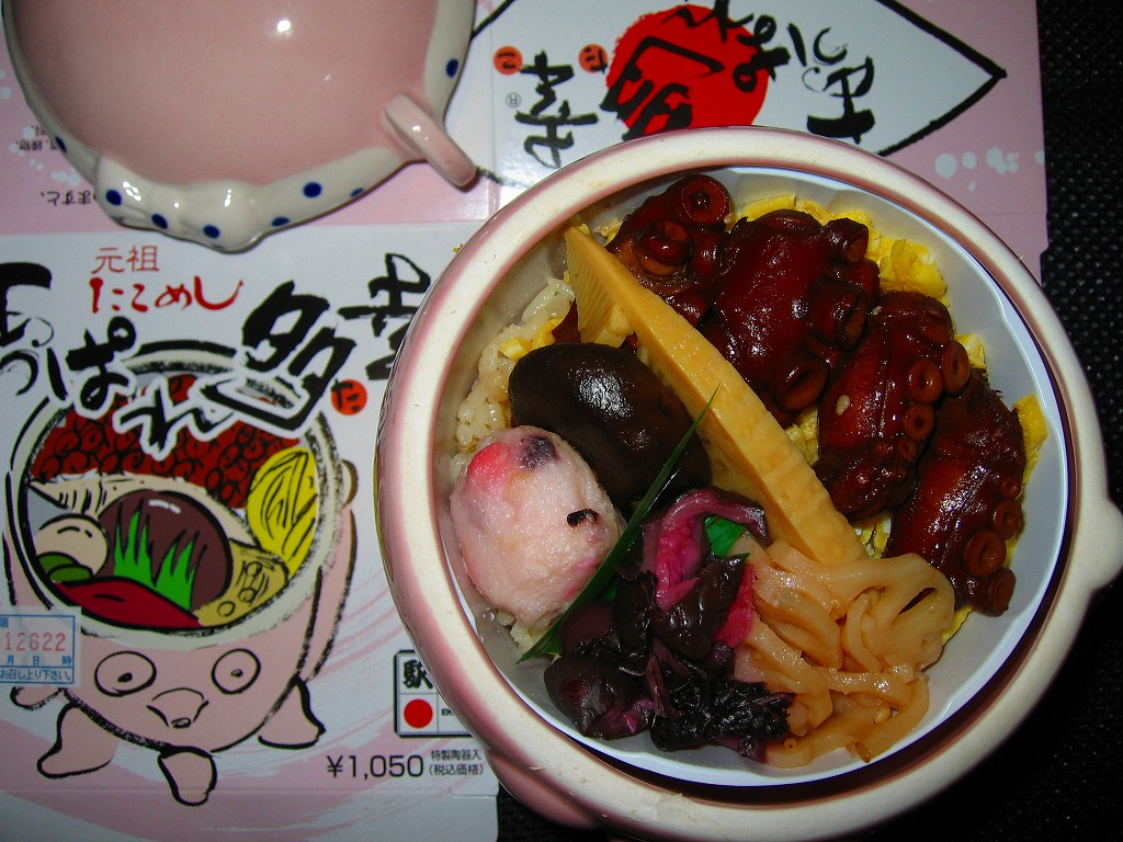 味に歴史の保証が付いているはずが、柴漬の刺激臭がタコの香りをかき消していた。最近こういうもったいない駅弁によく出会う気がする。容器で催事向け、催事受けタイプの駅弁に見えて、福山や三原でも一年中地道に売られている点には好感が持てる。陶器を風呂敷に包むバージョンもある模様。