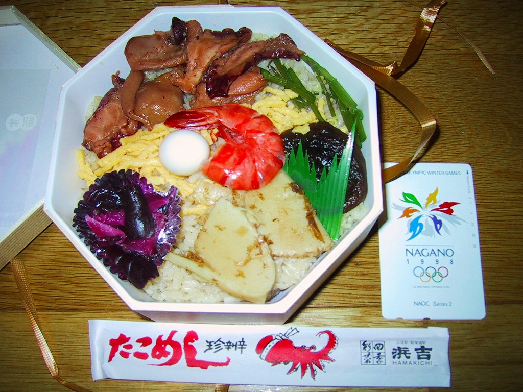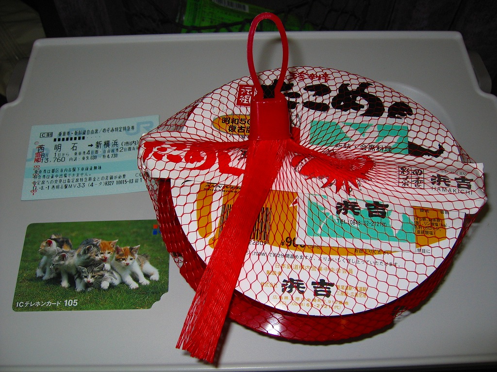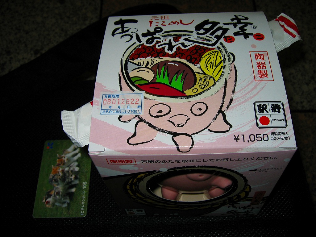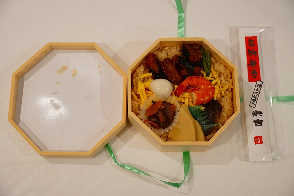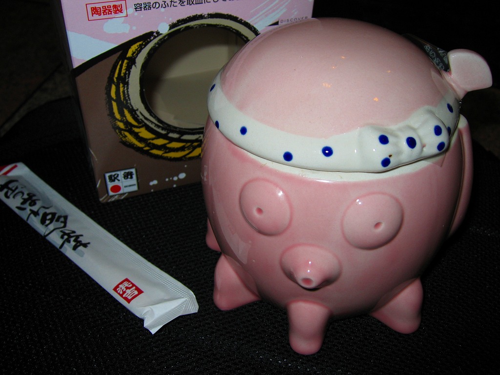 味に歴史の保証が付いているはずが、柴漬の刺激臭がタコの香りをかき消していた。最近こういうもったいない駅弁によく出会う気がする。容器で催事向け、催事受けタイプの駅弁に見えて、福山や三原でも一年中地道に売られている点には好感が持てる。陶器を風呂敷に包むバージョンもある模様。
