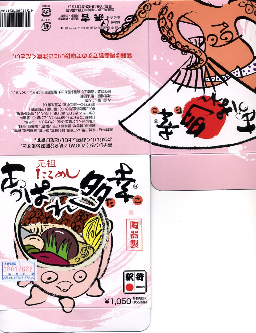 2005(平成17)年9月に発売。タコの炊込飯に味付けタコ脚、タコ蒲鉾、タケノコ、椎茸、れんこん、柴漬けなどという内容は、三原駅伝統の駅弁「珍辨たこめし」とだいたい同じ。これを詰めた紙カップを、タコをデフォルメした奇抜な陶器に収めて、そのイラストや商品名などえを描いたボール紙の箱に詰める。