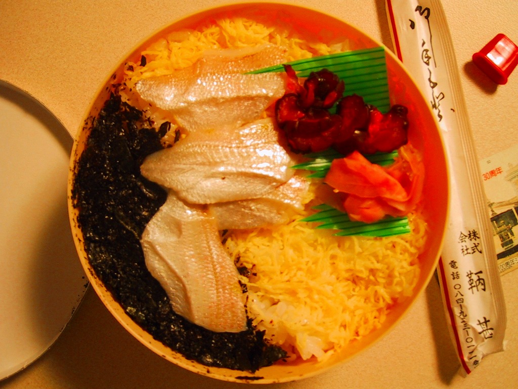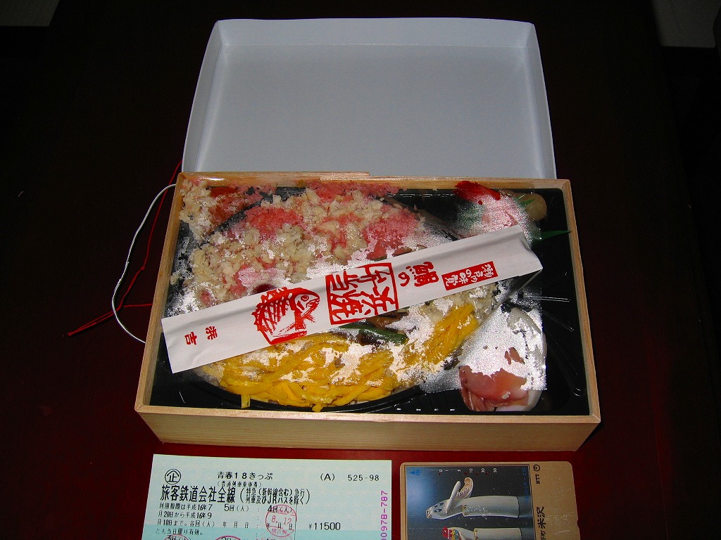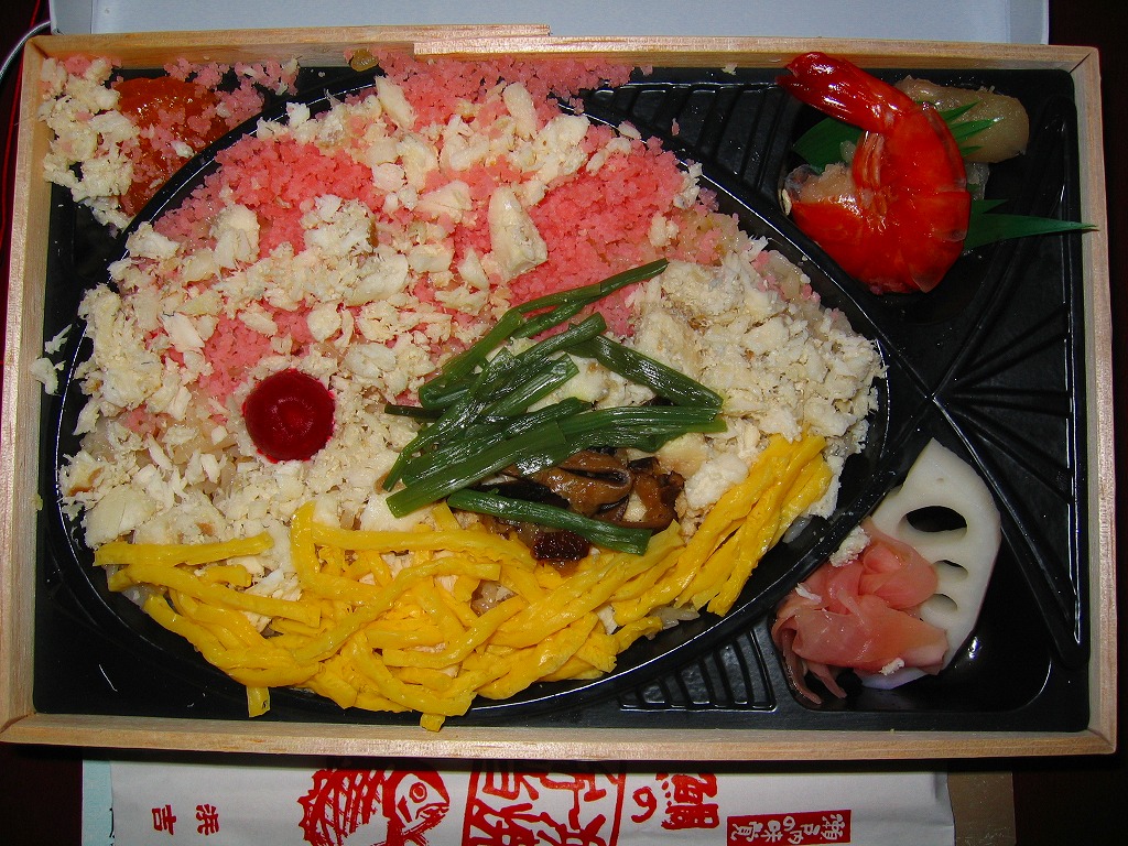 薄手のわっぱ風プラスティック容器に紙のふたをかけ、漁網をイメージしたと思われる網に割り箸ごと入れる。中身は酢飯の上に刻み海苔と錦糸卵を敷き、その上に香りと弾力性が豊かで味はほのかな鯛切り身を4切れ載せるもの。見た目も味も良い人気駅弁であったものの、駅弁業者の倒産により、購入日の翌々日の2003年1月14日限りで失われた。