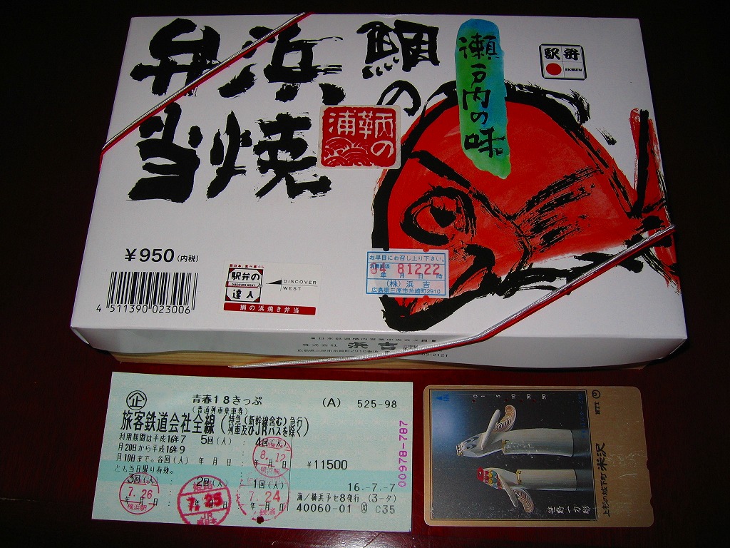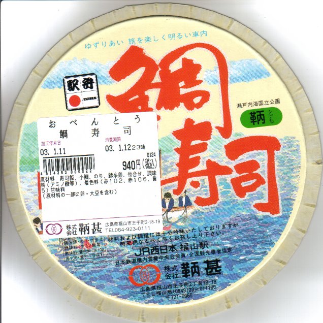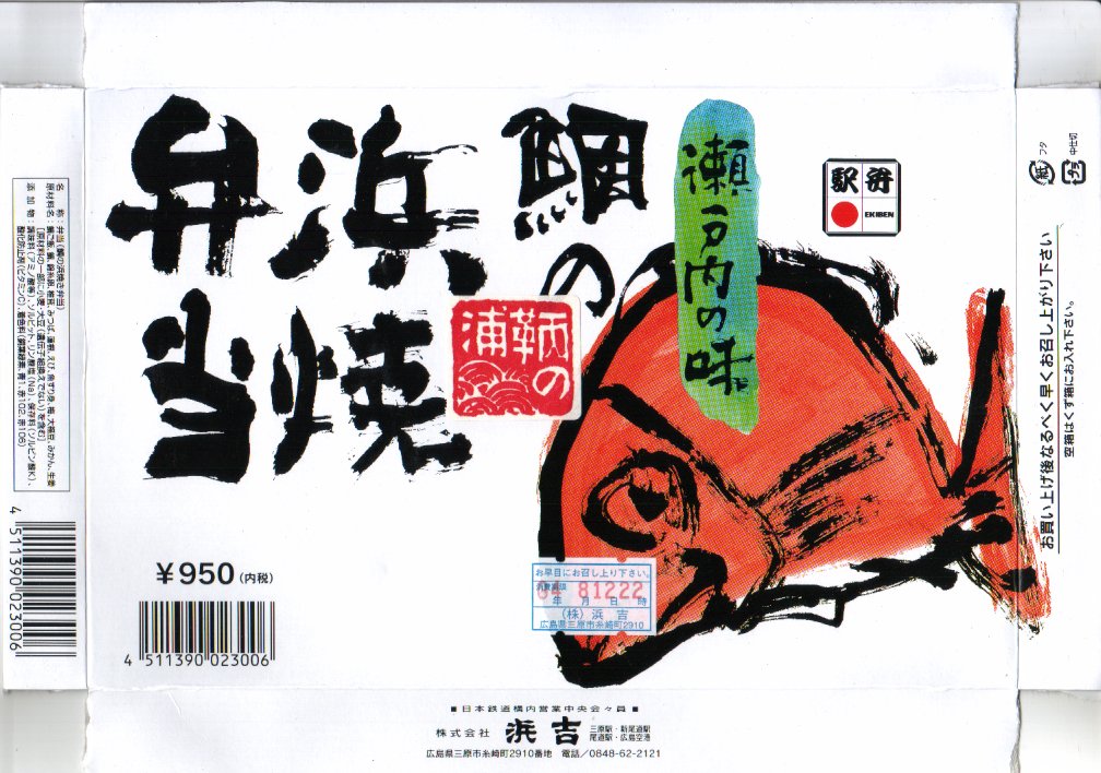 1998(平成10)年8月に三原駅で発売。長方形の木枠の容器に魚型をくり抜いた黒いトレーを入れてボール紙のふたをする。中身は鯛の混ぜ御飯の上に鯛焼フレーク・錦糸卵・桜おぼろを敷く。目玉の代わりに梅干しを、エラの代わりに椎茸やみつばを配置しているようにも見える。他は煮豆やみかん等の付け合わせ。香ばしい焼いた鯛の香りと柔らかい食感は、冷たい状態でもその特性を失っていない。福山駅弁の消滅を受けて、2003年3月1日から福山駅でも三原駅弁の取り扱いが始まったそうだ。2004年度のJR西日本の駅弁キャンペーン「駅弁の達人」の対象駅弁。現在は売られていない模様。