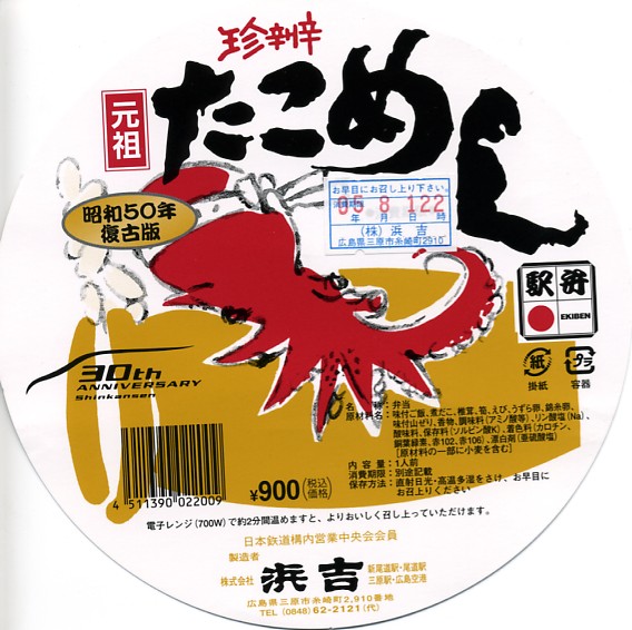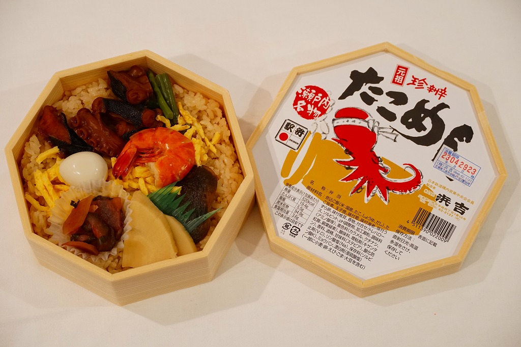 山陽新幹線博多開業30周年を記念して、2005(平成17)年1月23日から9月30日まで販売された、沿線12駅10駅弁業者による「復刻!懐かしの駅弁」シリーズのひとつ。1975年頃に三原駅で販売されていた、当時200円のたこめしを復刻したという。1975年当時と2005年時点で中身が変わっていないため、容器を復刻した。訪問時は現行版と併売されていた。