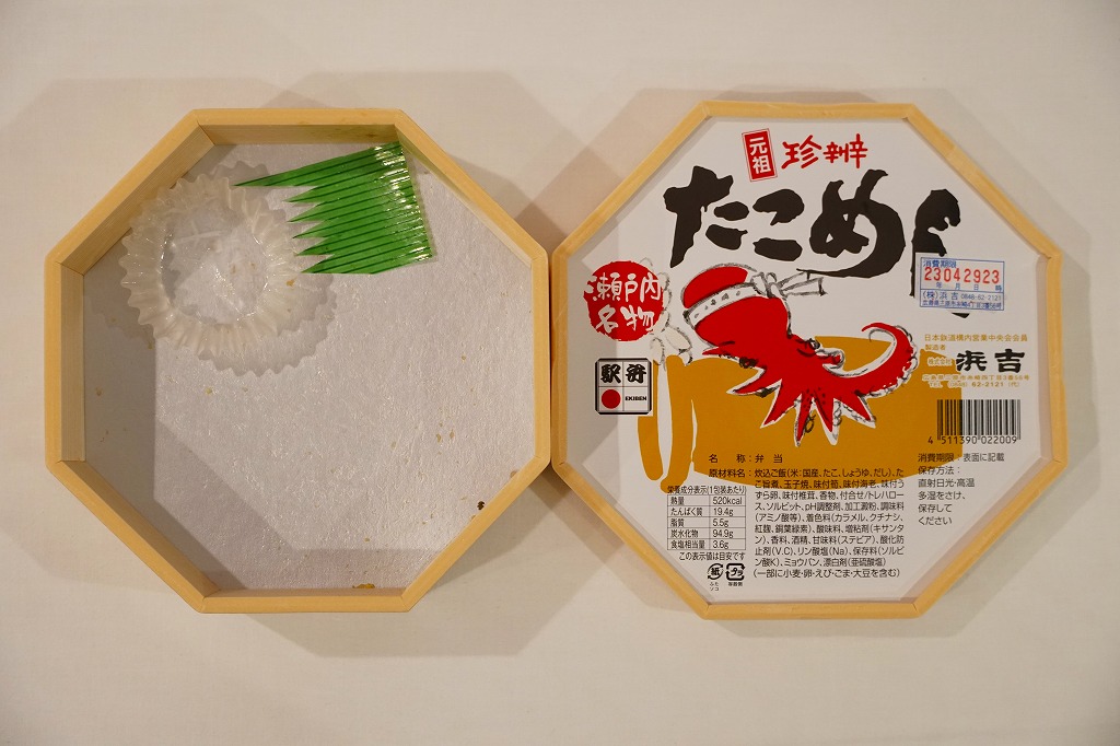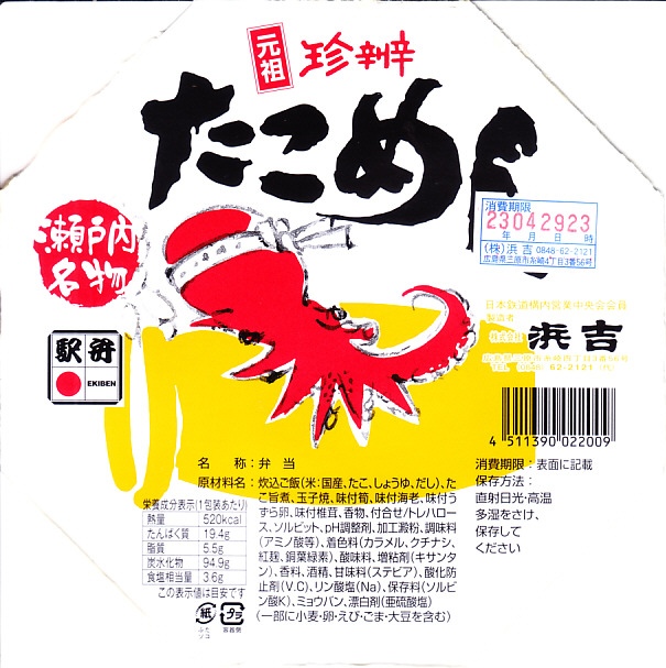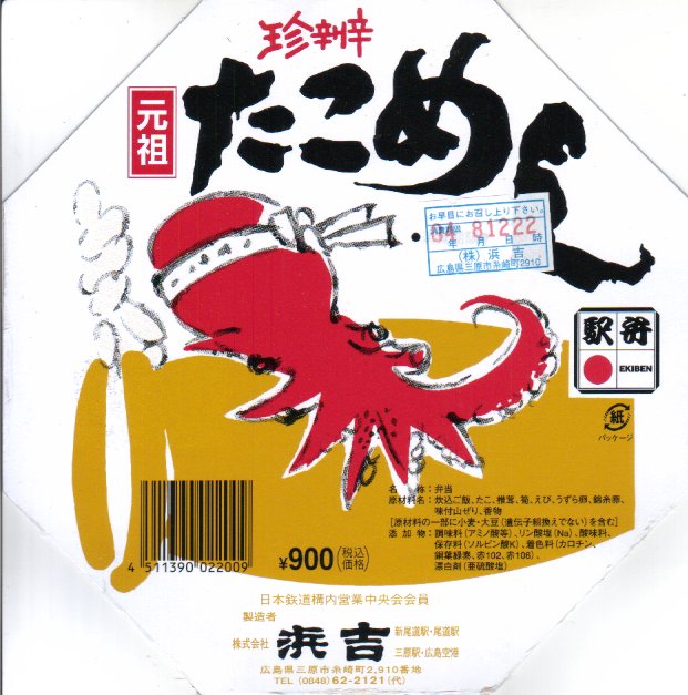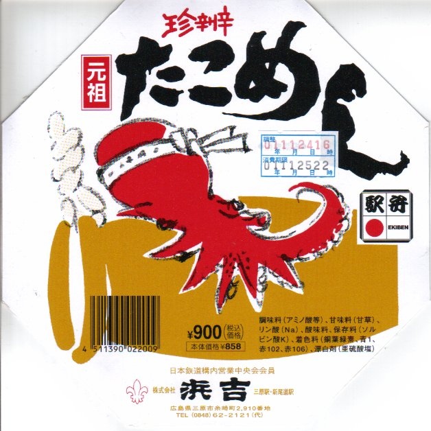 1953(昭和28)年8月に糸崎駅で発売。後の西明石駅や名寄駅あるいは大洗駅のものより古い、タコ駅弁の元祖。ただし昭和30年代の資料にその名がなく、昭和40年代になると出てくるが、その当時でも他駅の駅弁に類例のない「珍辨」=珍しい弁当だった。赤いタコが黄色いタコ壷にしがみつくふたの絵柄は、その当時の掛紙から変わらない。
