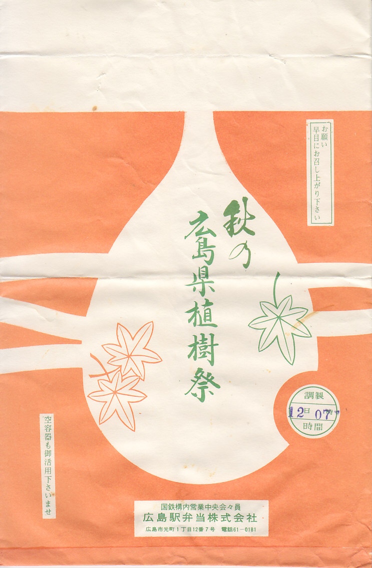 おそらく1970年代の、12日7時の調製と思われる、昔の広島駅弁の紙袋。その名のとおり秋の広島県植樹祭で使われた、仕出し弁当か何かのものだろう。弁当を詰めるにしては小さな袋であり、広島なのでおにぎりでも詰めたのだろうか。