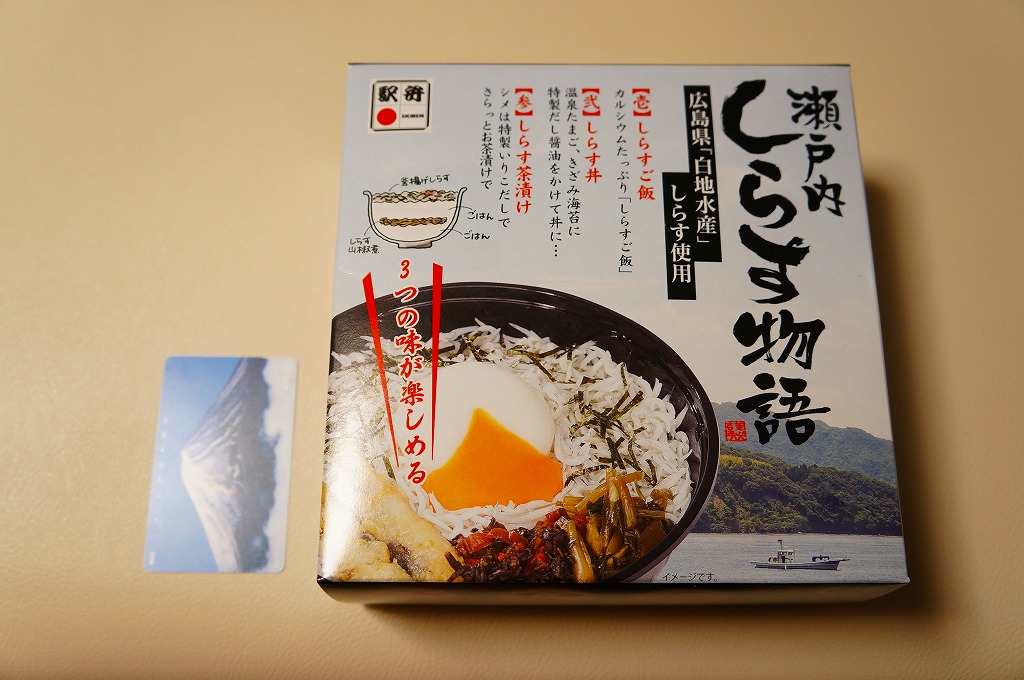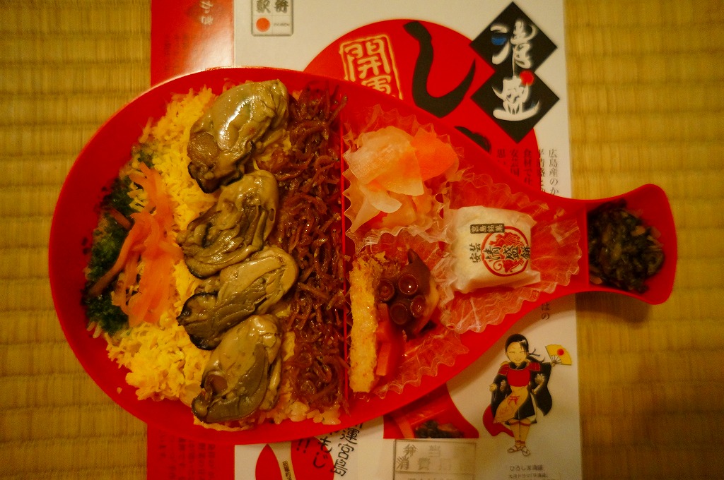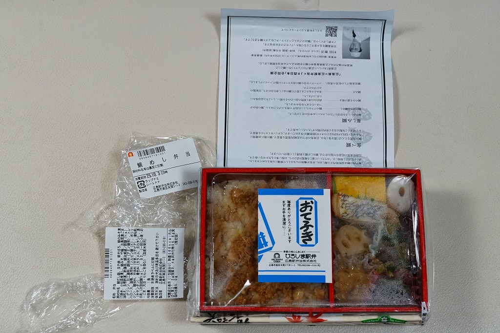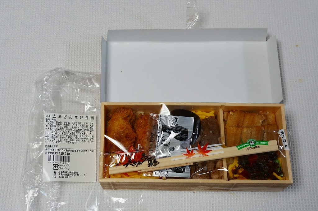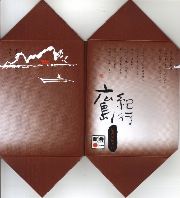 2015(平成27)年8月までに発売。小さな掛紙には広島が誇る観光名所「広島城」「原爆ドーム」「大和ミュージアム」「厳島神社」の地図が、簡単な絵柄で描かれる。中身はタコ飯、穴子飯、牛肉煮、煮物、揚げ玉子やカキフライなどの5区画。広島の食をなんとなく反映しているように見える、幕の内弁当でないけれどそんな用途に向いた駅弁。2020年の春頃までに終売か。