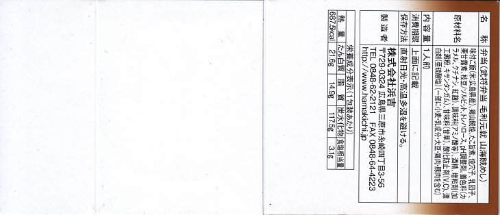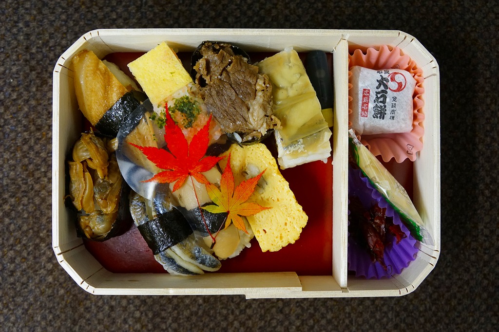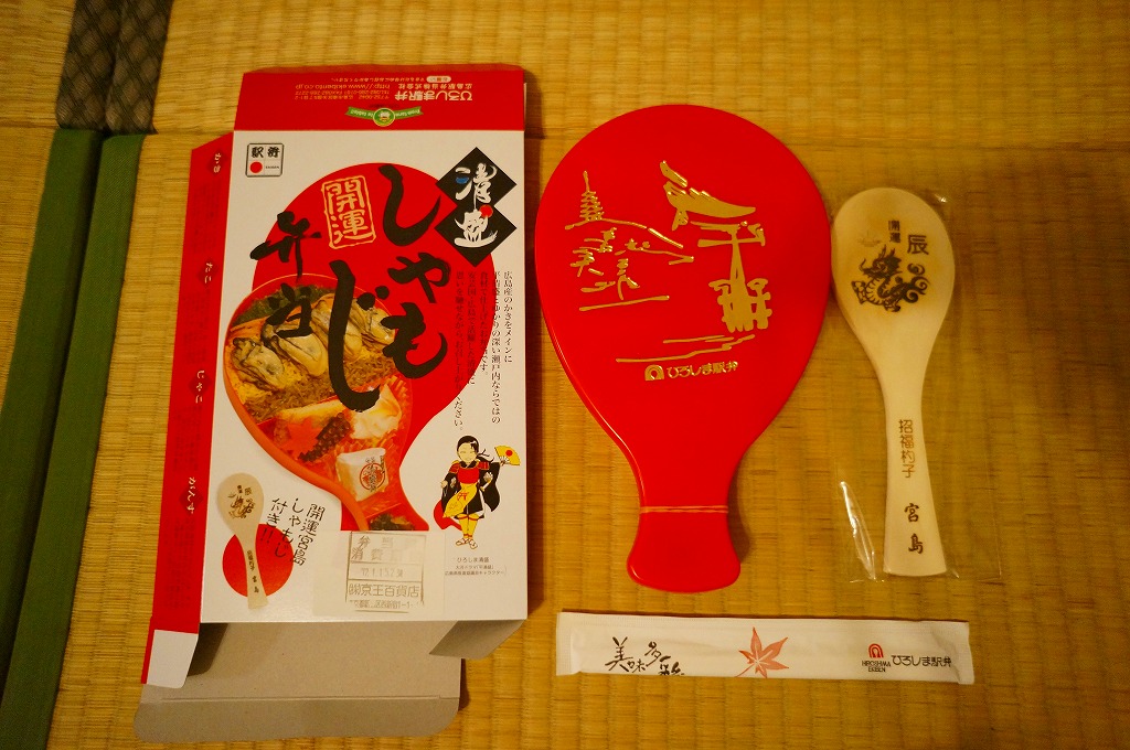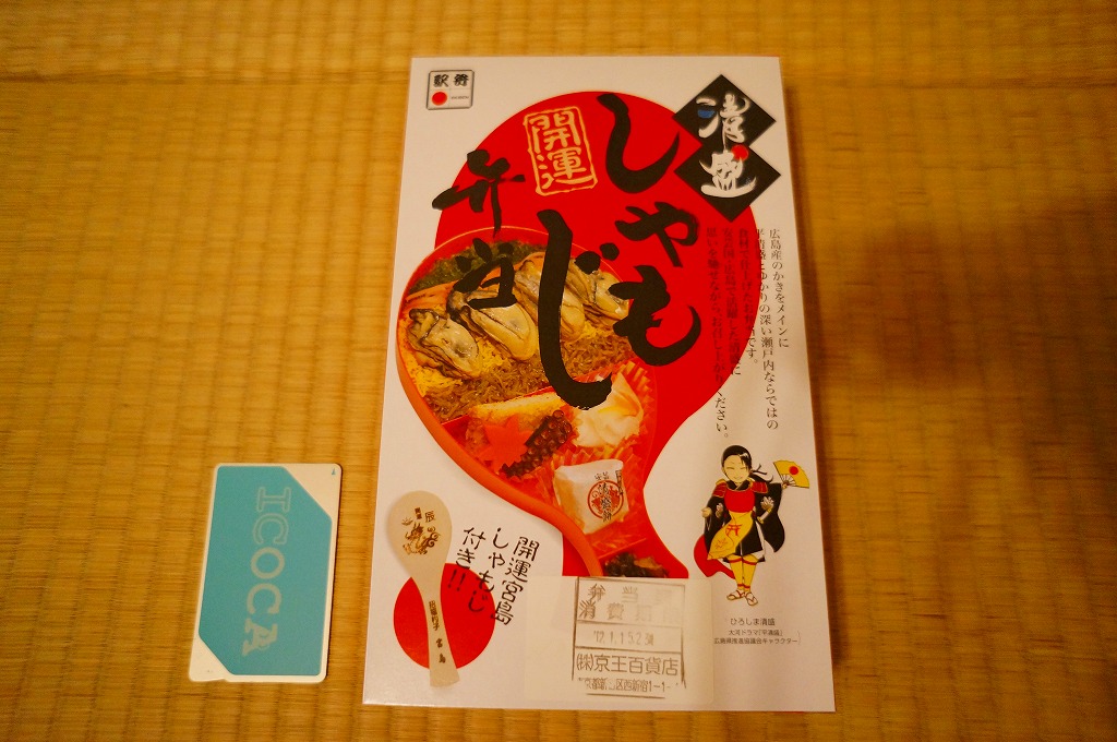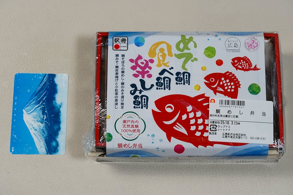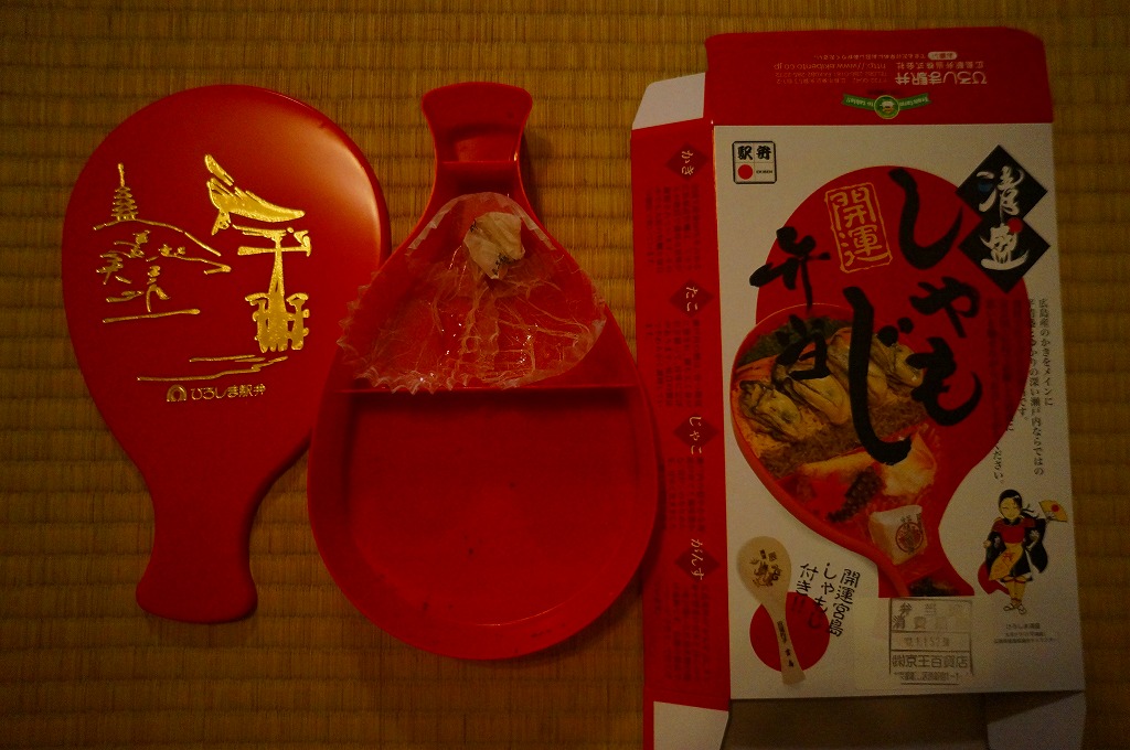 2015(平成27)年8月までに発売。小さな掛紙には広島が誇る観光名所「広島城」「原爆ドーム」「大和ミュージアム」「厳島神社」の地図が、簡単な絵柄で描かれる。中身はタコ飯、穴子飯、牛肉煮、煮物、揚げ玉子やカキフライなどの5区画。広島の食をなんとなく反映しているように見える、幕の内弁当でないけれどそんな用途に向いた駅弁。2020年の春頃までに終売か。