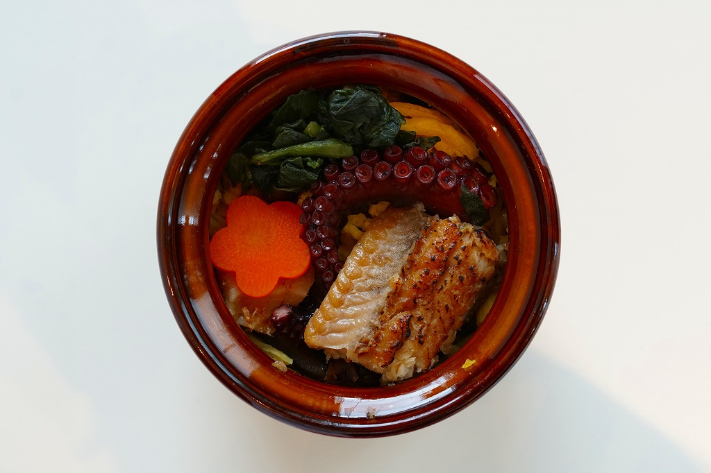 今回は黒いプラ容器が円錐状とボウル状で2種類あり、この毛利元就はボウル状のもの。これに毛利家の家紋を入れ、日本古窯弁当と同じ半透明のふたをして、今回のシリーズで共通のしおりを置き、それらしき絵柄のスリーブで留める。中身は茶飯を鶏山賊焼、タコ煮、焼アナゴで覆い、くりと乳団子を添える。味はこの調製元の福山駅弁と、同じように柔らかいアナゴと、固く締まるタコと、記憶にない鶏などで、食べればまあうまいもの。広島を代表する食材のタコ、穴子、神明鶏を釜めし風に、毛利元就が好んだ餅は、広島名物「乳団子」を添えたのだという。丸一日の日持ちがする弁当としてはよいと思う。これは2023年1月の京王百貨店の駅弁大会でも販売。